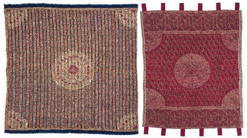 Highlights include an early 19th century square shawl with a remarkable and unusual pattern which combines stripes with the central moon design – estimated between USD 8,900-12,700. Moon shawls are known to have been modelled after a type of sixteenth century carpet from the Ottoman court in Cairo. Striped examples were especially valued by members of the royal court of Jaipur in Rajasthan. Moon shawls were also very popular in Western markets especially with fashionable ladies in Britain in the late 18th and 19th centuries to be worn as accessories with their gowns.