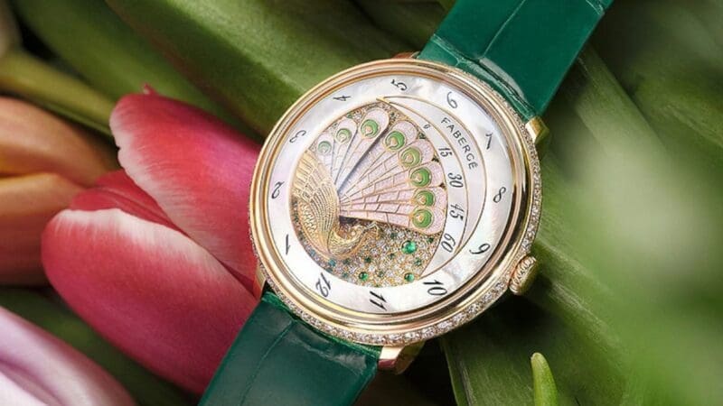 The second category comprises Fabergé’s timepieces, some of which have been co-developed with Agenhor Manufacture. They made their debut in 2015 with Compliquée Peacock. It was greeted with high praise and awarded the Grand Prix d’Horlogerie de Genève. Its distinct dial features a hand-engraved peacock in 18 karats white gold as the centrepiece, along with diamonds, Paraiba tourmalines and tsavorites. The bezel is diamond-set. The minute and hour indicators are in mother of pearl. The hand-winding movement is encased in a 38mm platinum case, with alligator strap.