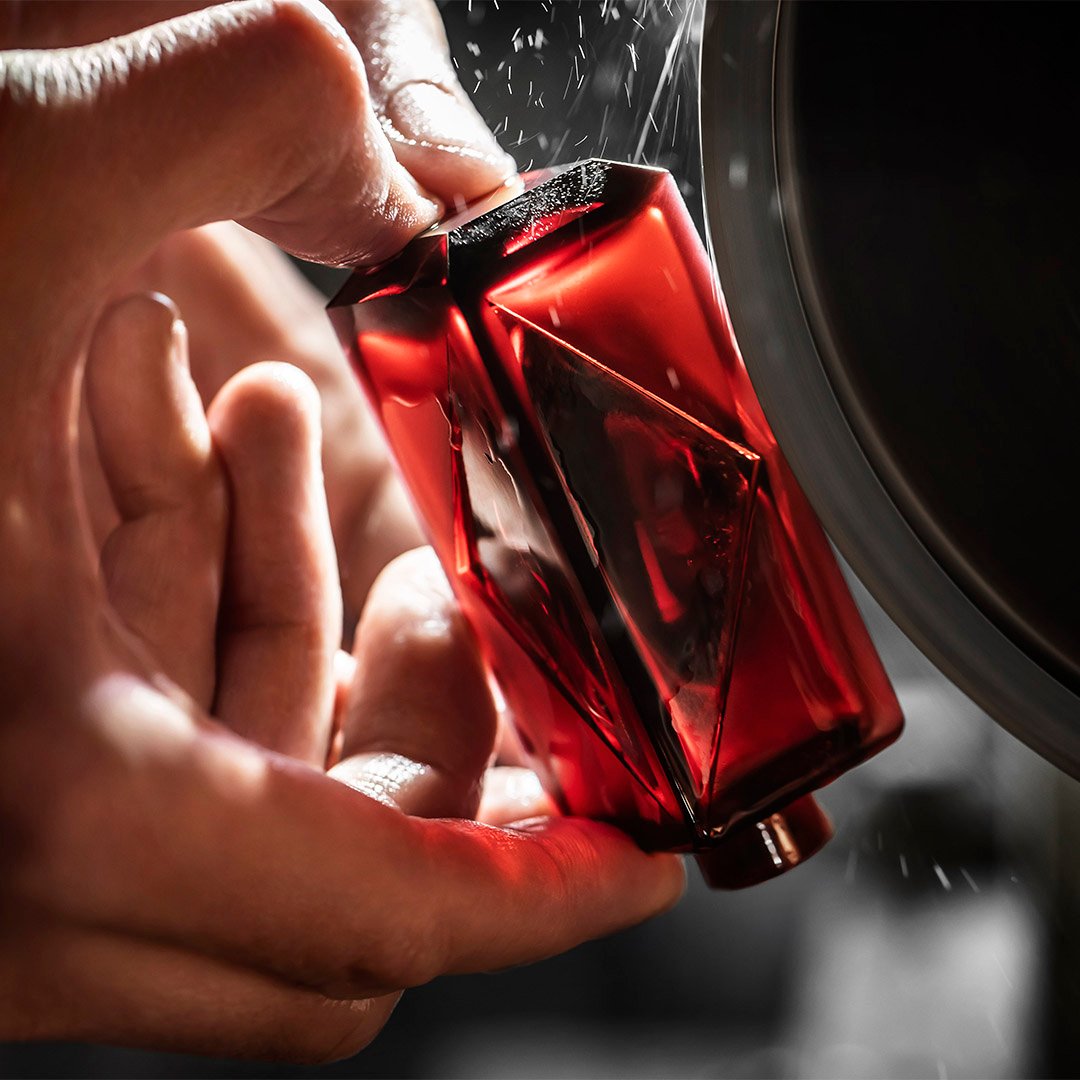 The bottle, imagined by long-time artistic collaborator Fred Rawyler, transforms craftsmanship into architecture. Its beveled lines form a subtle “K,” capturing the Maison’s modern geometry while amplifying the glow of red crystal. Each piece demanded more than five hundred hours of work by nineteen artisans—glassblowers, engravers, sculptors—who preserved the tradition of hand and flame while infusing it with contemporary purity. The cap, plated in 24-carat gold, and the engraved serial number beneath affirm that this object belongs as much to the world of art as of fragrance.