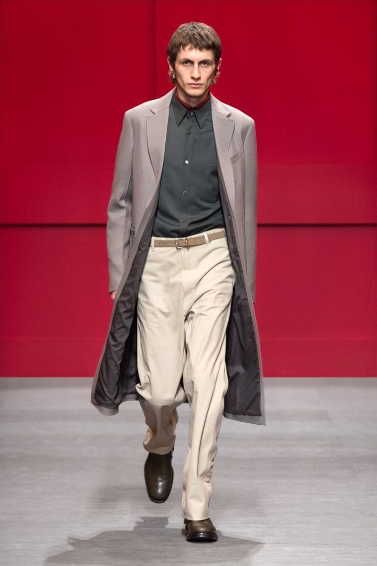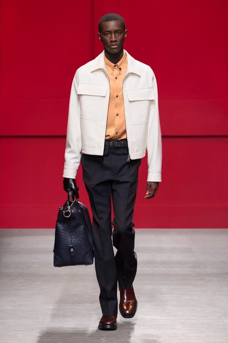 In the collection “a new construct of dressing emerges: familiar forms are stripped back, loosened and elongated with ease and elevated functionality. Traditional silhouettes are expertly dissolved for a contemporary take on formal codes. Materials are unrivalled: from plush leathers to Italian wool fabrics, to heavy silk twill and soft cottons. Broad strokes of colour were the starting point; merlot reds and mustard yellows mix expertly with parakeet green and deep Vatican blue between hints of nude and blush” reads a statement from Ferragamo.