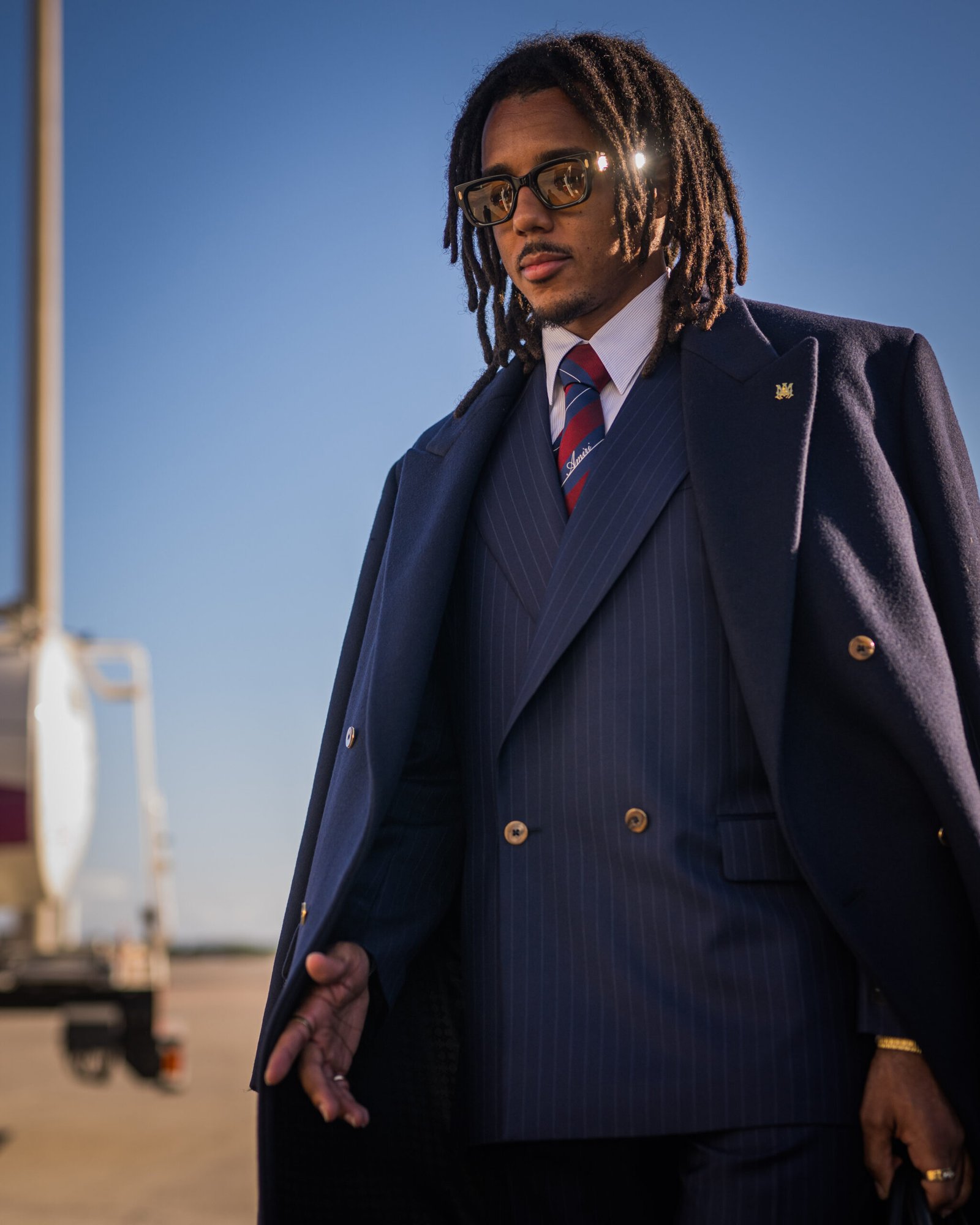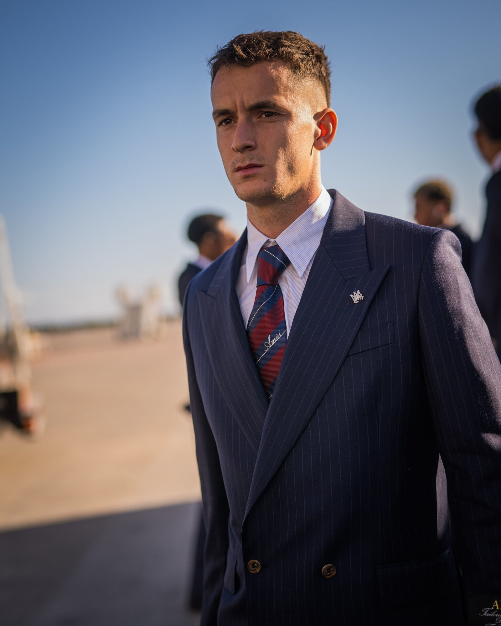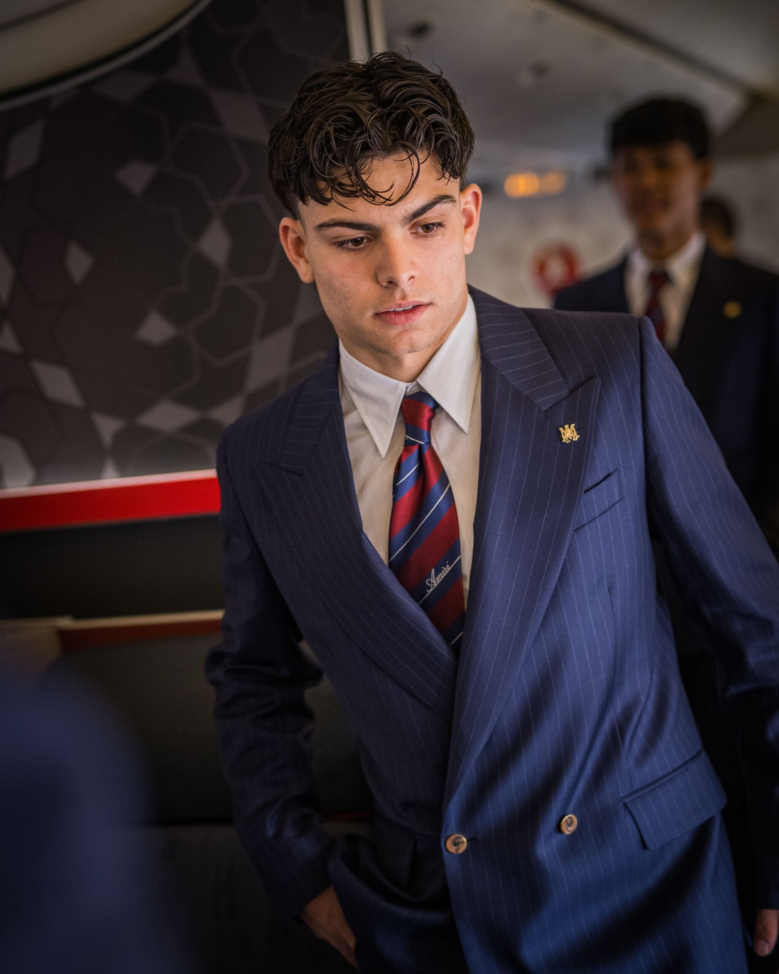 Inspired by the club’s iconic blue and garnet colours, AMIRI’s bespoke designs translate the energy and identity of equip blaugrana into refined tailoring. For the Winter 2025 season, the collection features precisely cut wool six-button overcoats and pinstripe suits—double-breasted for men, single-breasted for women—crafted in deep navy wool. Gently flared trousers and garnet-and-blue striped ties add a touch of heritage, while gold bar tie clips nod to understated luxury.