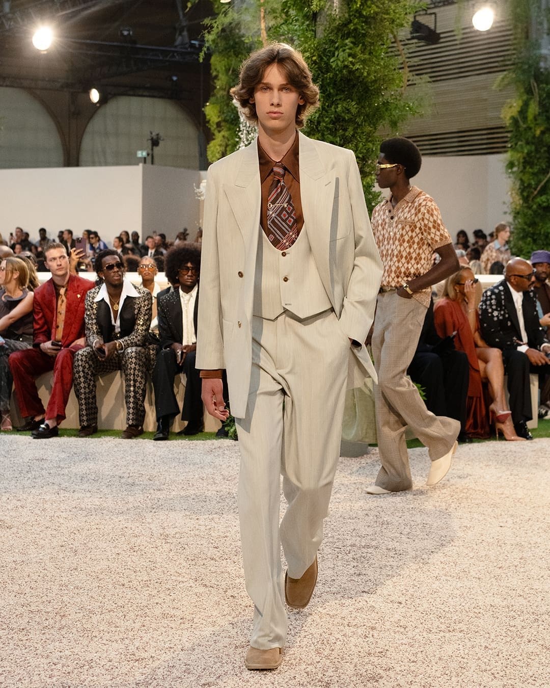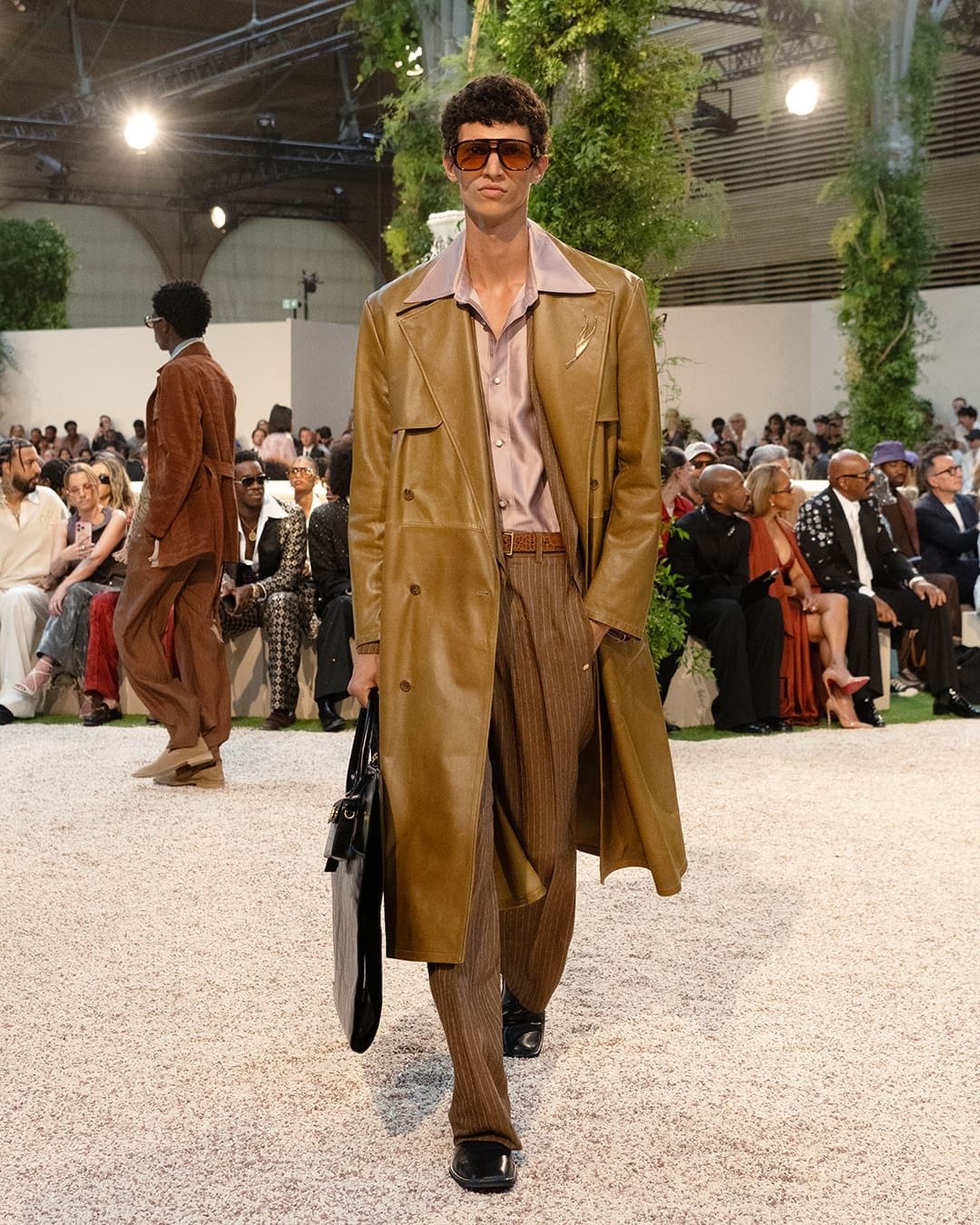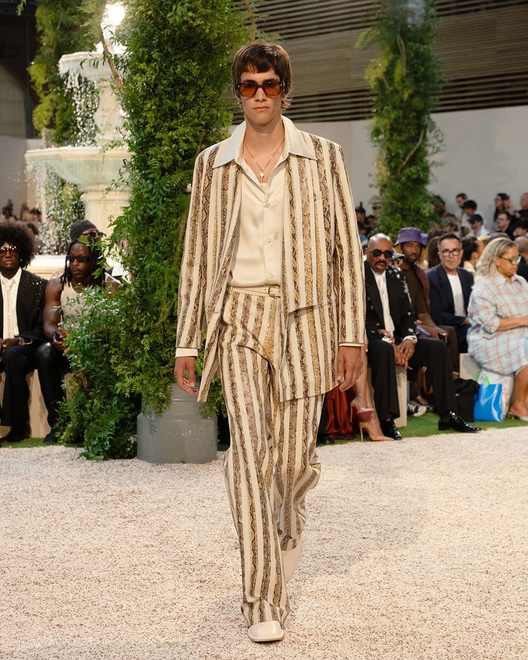 The show, though theatrical in presentation, is grounded in quiet luxury. There’s a sincerity to the narrative Amiri constructs—these aren’t just clothes, but expressions of persona, mood, and moment. Pieces like feather-trimmed tuxedo shirts and embellished lounge sets evoke a mood of indulgence without ostentation. They’re clothes for those who appreciate intimacy in detail—soft textures, whispered color, the weightless grace of craft. It’s luxury you feel before you see.