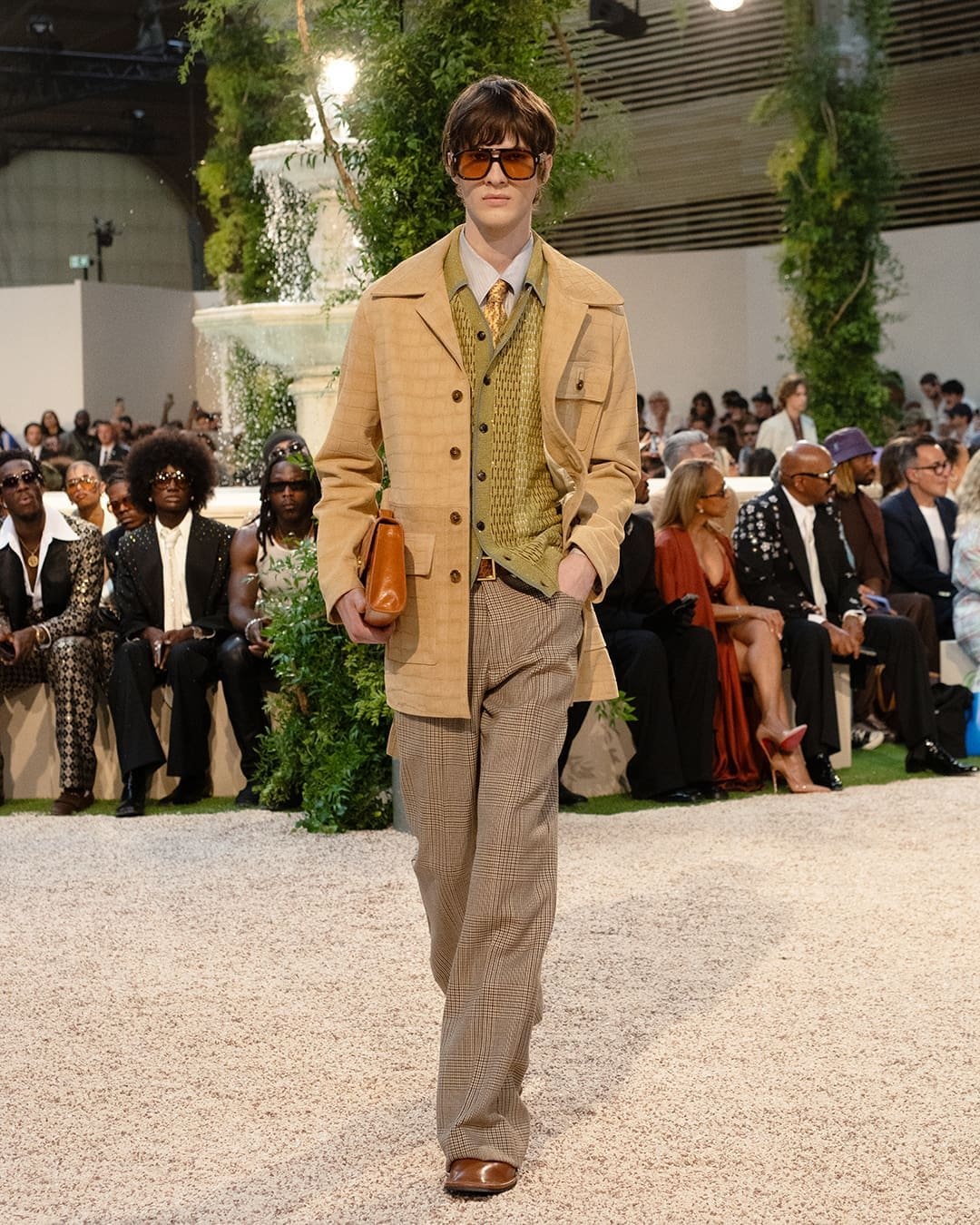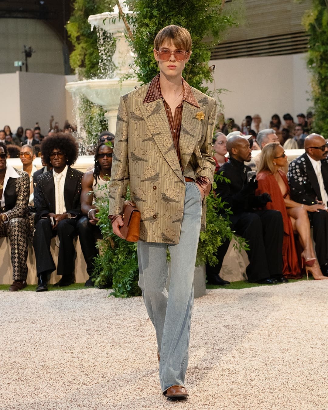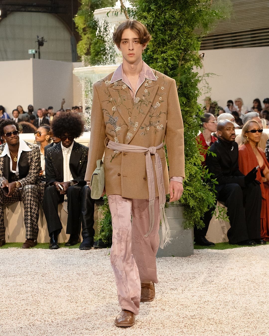 The collection drapes itself in motifs of hotel lore—monogrammed slippers, lush upholstery, tasseled key-fobs—reimagined into fluid tailoring, feather-light jacquards, and silken suiting. Artist Wes Lang’s time spent creating art in Room 34 of Chateau Marmont inspires embroidery and textile detailing, with birds and beaded flora drifting across garments like whispered stories. Loungewear aesthetics—robes, pajamas, and smoking jackets—intertwine with sophisticated tailoring in desaturated pastel tones of mint, raspberry, and pale gold, capturing the feel of a long, sunlit Californian afternoon.