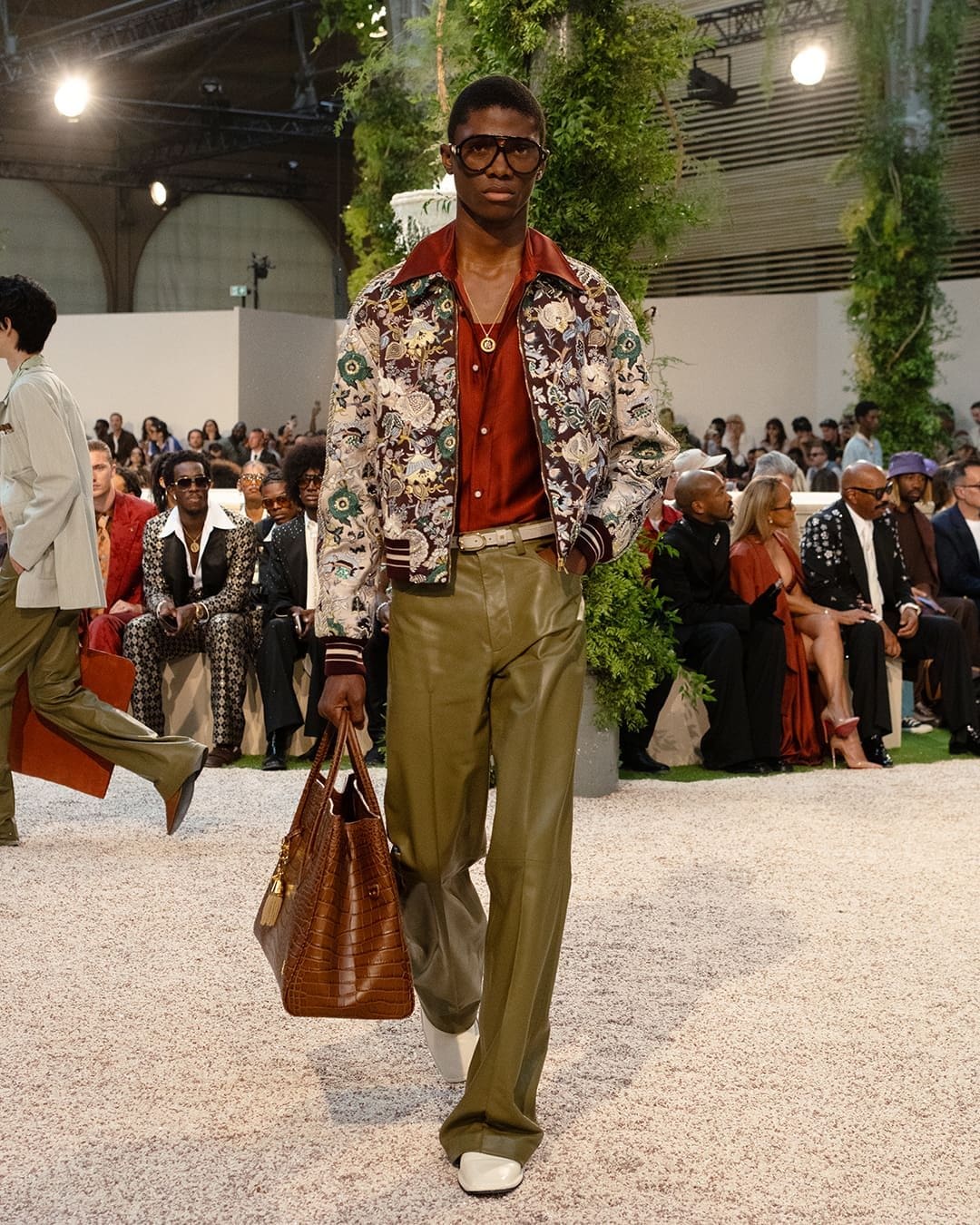The silhouettes harken to 1970s coastal elegance: wide lapels, elongated lines, and dropped shoulders lend a swagger and softness, suited to both men and women. Evening jackets share space with pajama shirts; vintage motifs brush against contemporary minimalism. The footwear is comfort elevated—jacquard hotel-style slippers and collapsible-back moccasins adorned with the AMIRI emblem. In womenswear, sleek gowns in crochet and open-knit fabrics glow beside silk suits in jewel tones, with lace detailing nodding to the intimacy of lingerie. The debut of the “Honey” bag in crocodile-embossed suede adds a tactile, slouchy punctuation to the collection’s relaxed glamour.