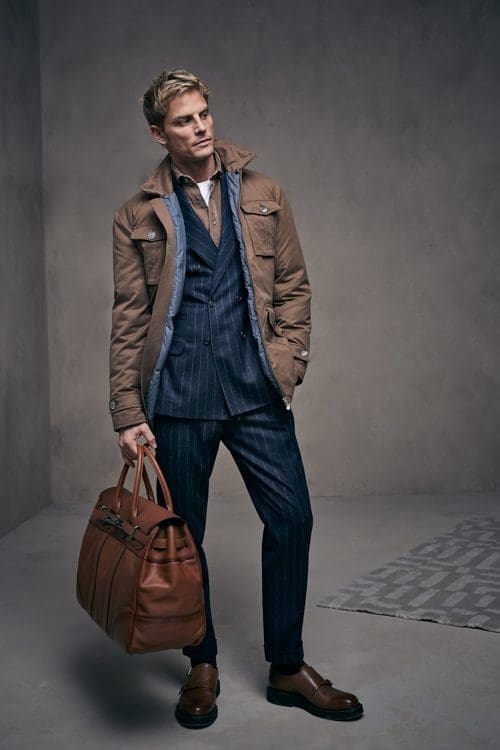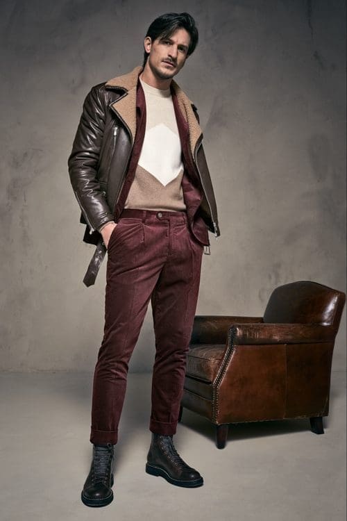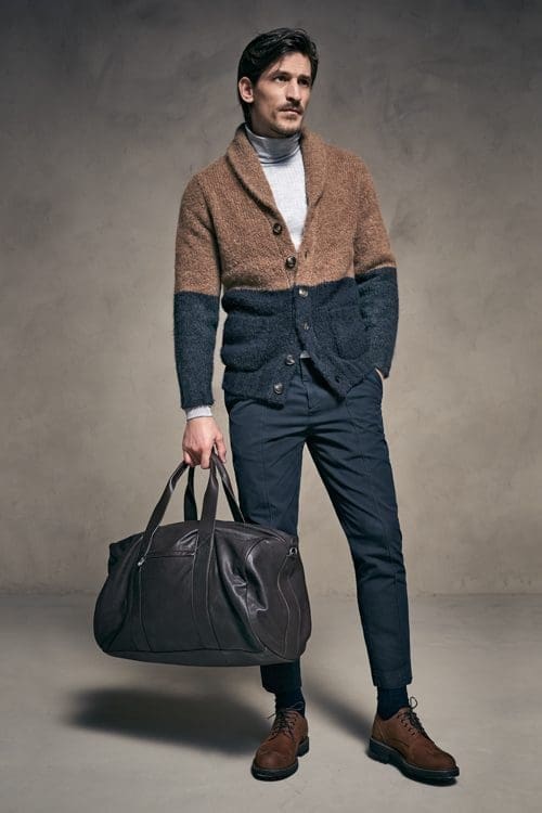 Coats, cabans, and other outerwear create soft, modern silhouettes and are enriched with details such as collars of soft shearling, knit inserts, bibs, and removable paddings; everything contributes to making each model unique, maintaining its identity intact. Jackets set the standard for elegance, close to the body as always, to flatter the male shape. The volume of trousers is softer and more modern.