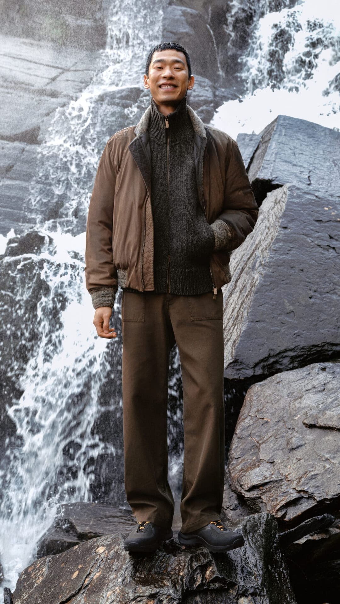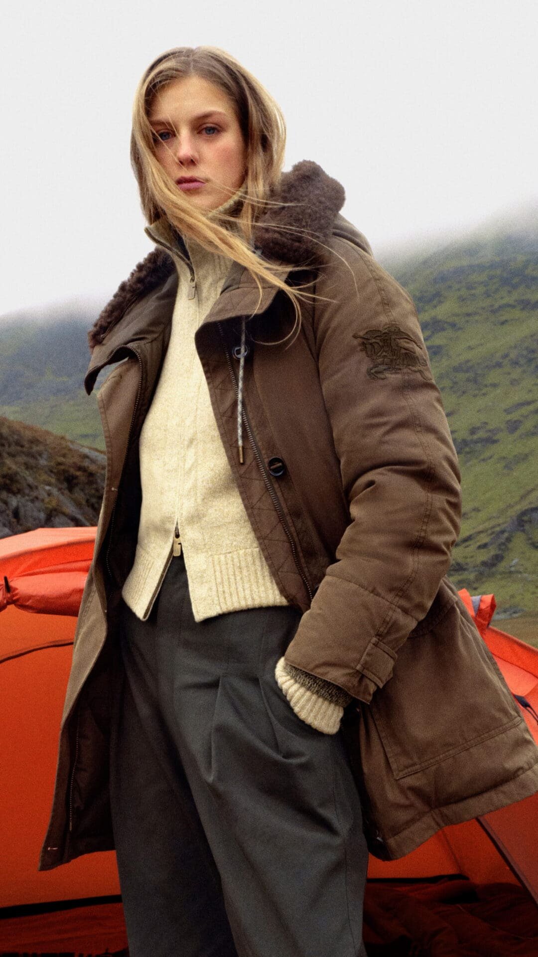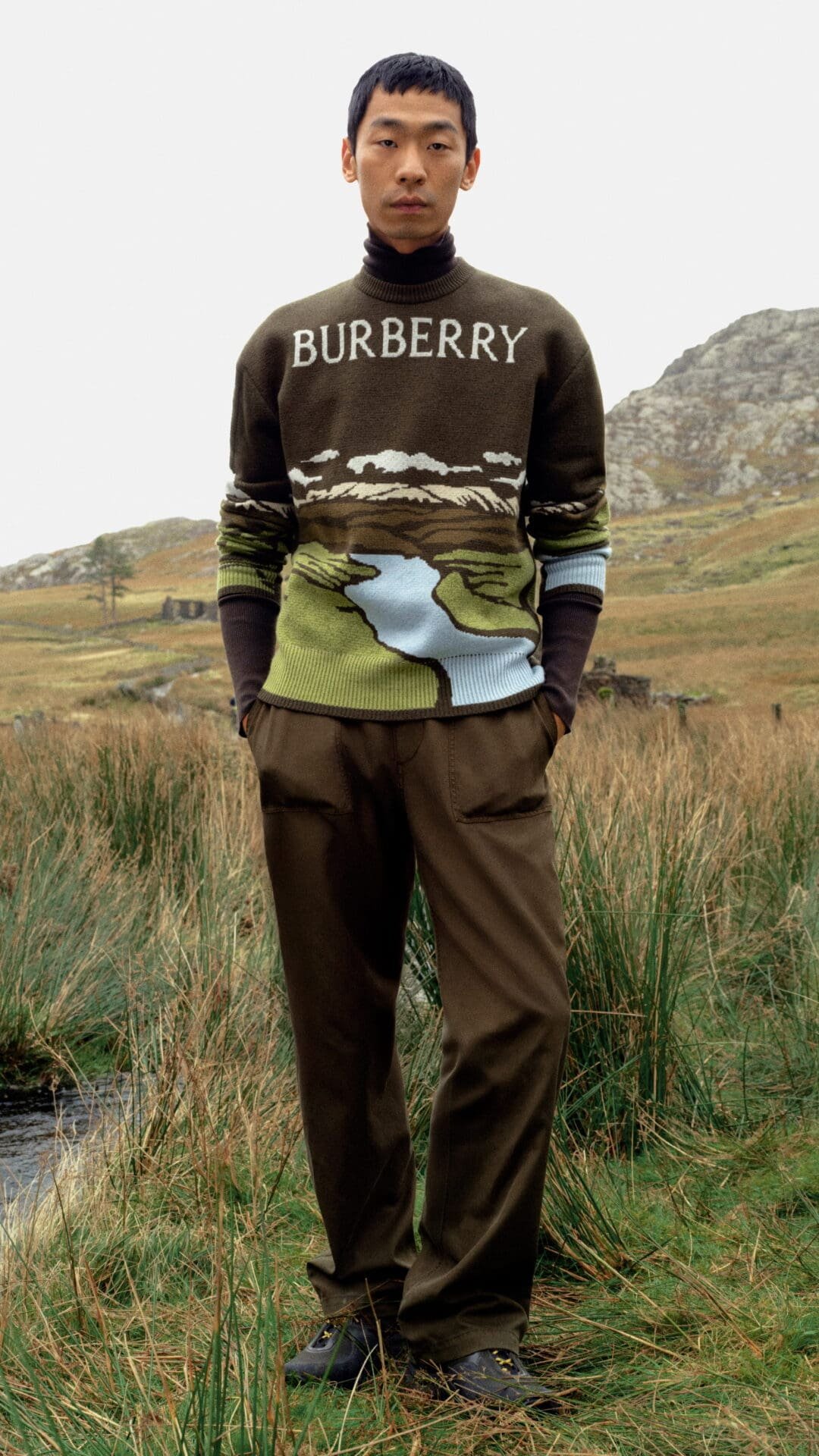 Set against the raw landscapes of Snowdonia, Wales, the accompanying film captures gabardine in its natural habitat. Wind, rain, and shifting light become collaborators rather than obstacles. The collection is worn by explorers and models alike, reinforcing Burberry’s long-standing relationship with the outdoors. Nature is not a backdrop, but a proving ground.