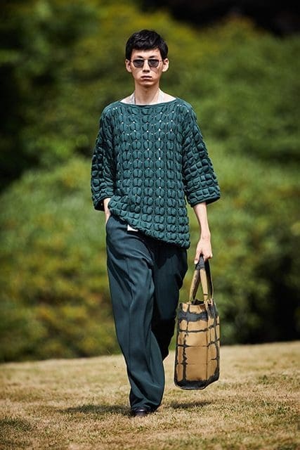A sense of fluidity pervades the collection, both in the shapes and in the choice of colours – clay, cowslip yellows, hydrangea pinks, sienite greys, river stone blues, carabus greens and slate blacks. Volumes are generous. Materials are lightweight yet firm – wool, hemp, raw fibres, linen, paper silk, and papery nappa. We also have #UseTheExisting wools – Zegna’s material upcycling program in which natural discarded materials are reused with the help of innovative processes.
