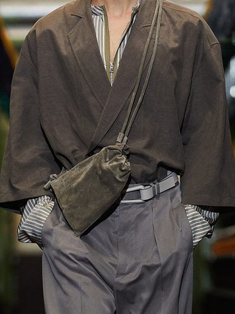 The collection’s accessories and bags commemorate the brand’s 110th birthday by featuring Zegna’s vintage logo, reimagined as a modern icon. Rounded loafers with massive soles and sandals ground the looks.