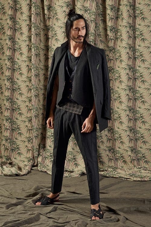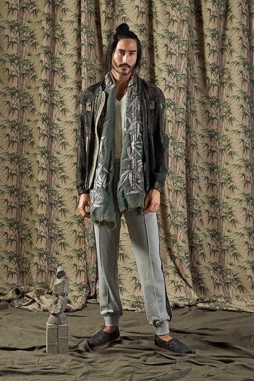 Silhouettes are soft and flexible, moving in tune with the body and designed to age with dignity. Suiting is cut generously: long, double breasted blazers with peaked lapels, wide trousers with deep pleats, built in belting on trousers that references 1930-era styles. The bamboo motif, an integral part of this collection, is woven into elegant suiting and layered over with embroidered panels. Accessories are exquisitely conceived. Espadrilles are loosely braided in the style of Viennese cane work, while simple leather loafers are printed in a snakeskin and crocodile motif, thus, leaving the animal out of the process.