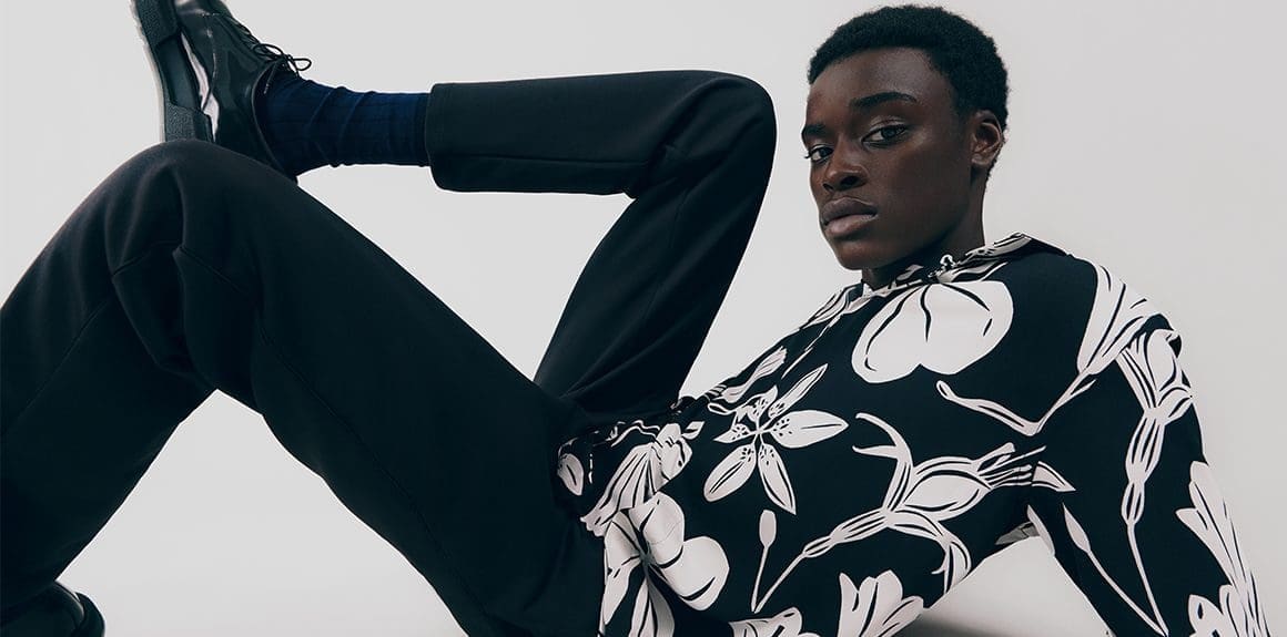 This spirit of reinvention returns when check and houndstooth tailoring is British in its feel but has the fluidity of lightweight Italian cloths. A heavy jumbo corduroy in the predominant sky blue injects cloud-like bounce into the collection and elsewhere proportions are exaggerated in puffer jackets and trainers to create an air of dreamy fantasy. Denim–a regular feature of Paul Smith catwalk collections–appears raw, indigo-washed and overdyed with a floral camouflage.