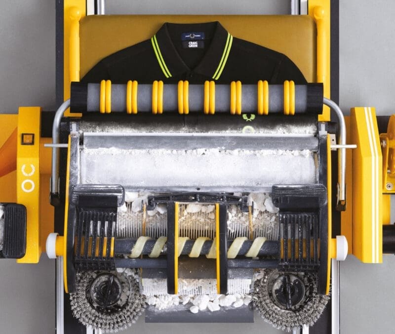 For Spring/Summer 2025, the collection finds its starting point on the tennis court. Green treats the Fred Perry polo shirt not as a garment but as a canvas, absorbing the raw textures and materiality of the game itself. It’s a collision of the athletic and the artistic, where heritage sportswear is infused with unexpected narrative depth.