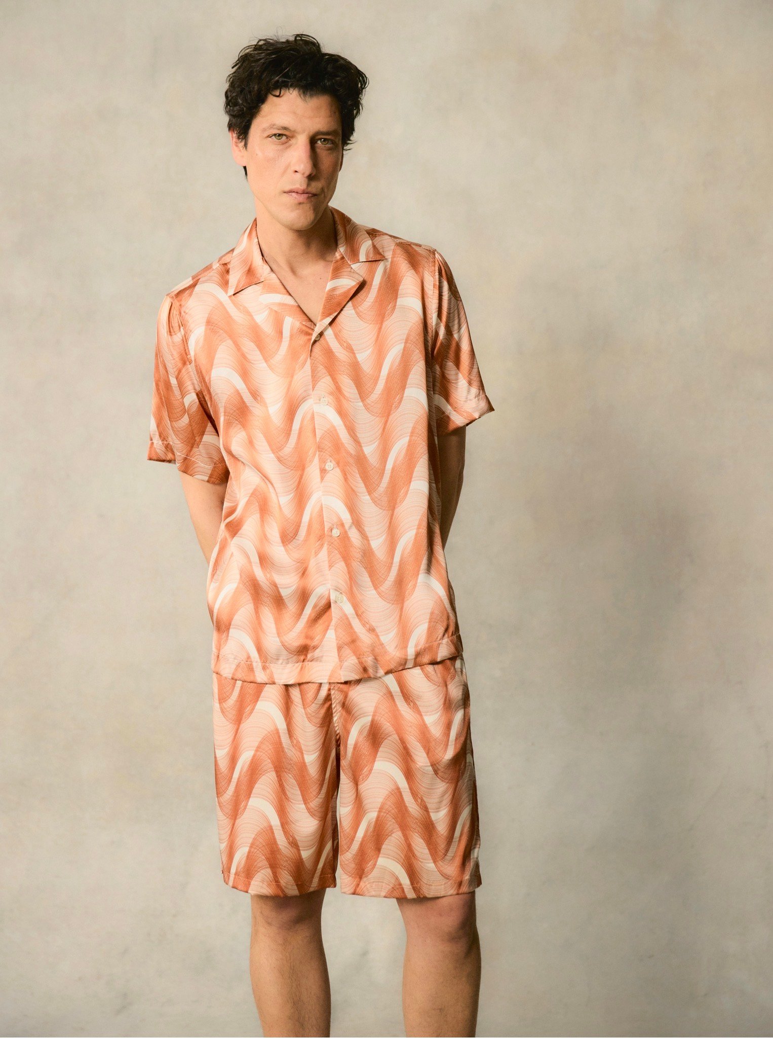 At the heart of the capsule lies Dunas, an exclusive print inspired by the undulating patterns of desert dunes. The motif appears across the Roberto silk shirt and Palma shorts set, forming a lightweight pairing that captures the fluidity of shifting sands. The abstract design subtly references Frescobol Carioca’s iconic Copacabana wave, bridging the brand’s Brazilian coastal heritage with the Middle East’s desert landscape.