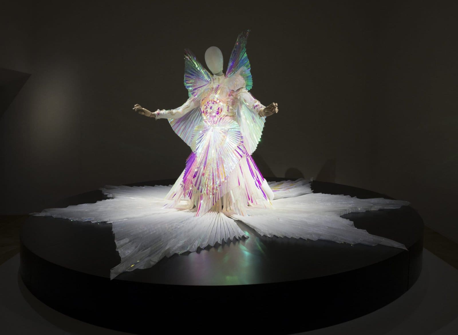 The other objects on display, all of which appear in “The Gate” video, contribute to the video’s visual beauty and layered meaning. As with the ‘star’ dress, these objects are also the material products of the imaginations of Björk and Michele. They consist of a second gown, and an array of accessories. Also exhibited are two elaborate face masks that were conceived by Björk and embroiderer James Merry. On the wall is an audio-visual display presenting Björk’s music video. Also, on display are a selection of books that were inspirations for the film and the gown.
