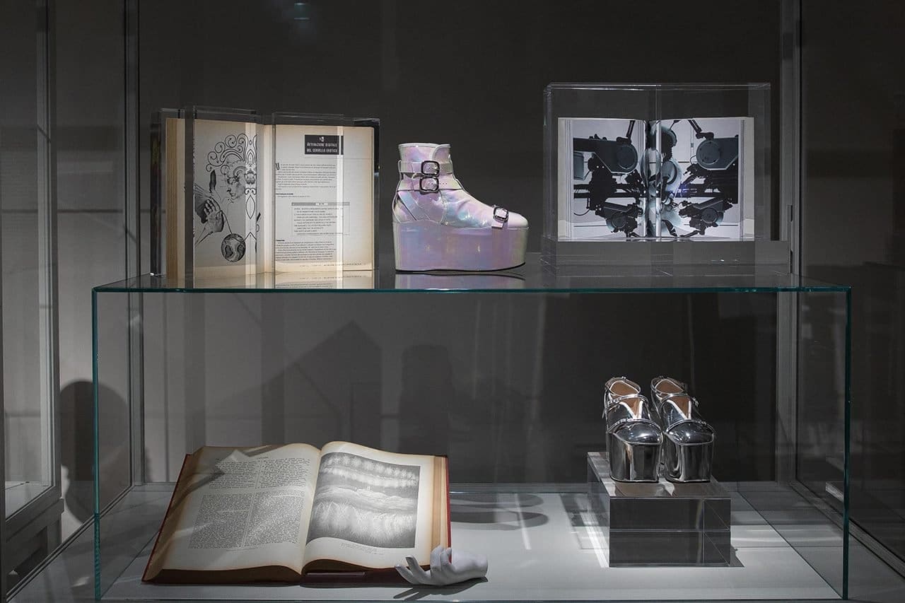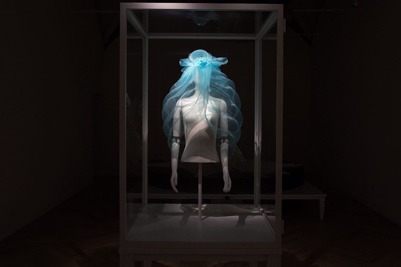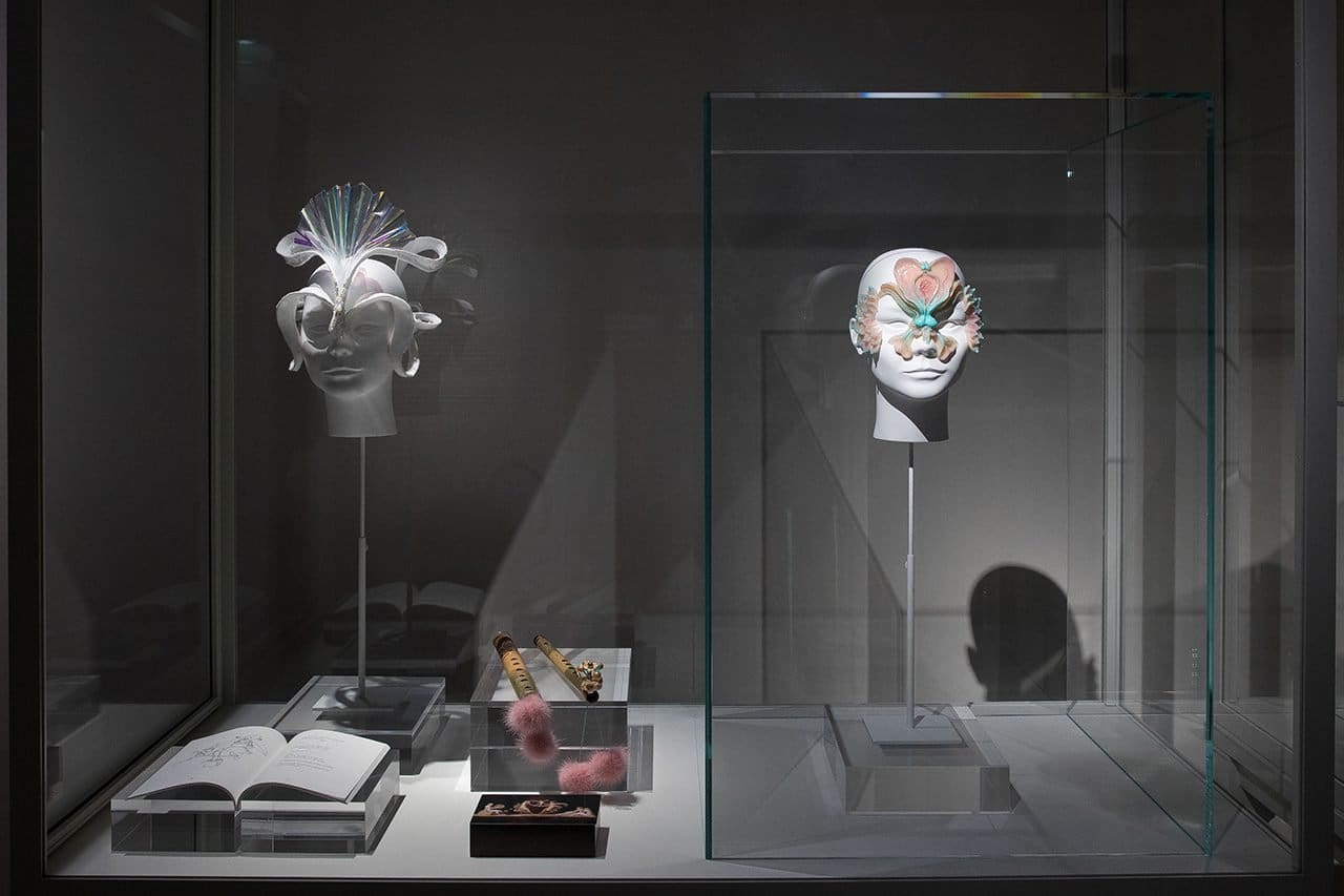 The other objects on display, all of which appear in “The Gate” video, contribute to the video’s visual beauty and layered meaning. As with the ‘star’ dress, these objects are also the material products of the imaginations of Björk and Michele. They consist of a second gown, and an array of accessories. Also exhibited are two elaborate face masks that were conceived by Björk and embroiderer James Merry. On the wall is an audio-visual display presenting Björk’s music video. Also, on display are a selection of books that were inspirations for the film and the gown.