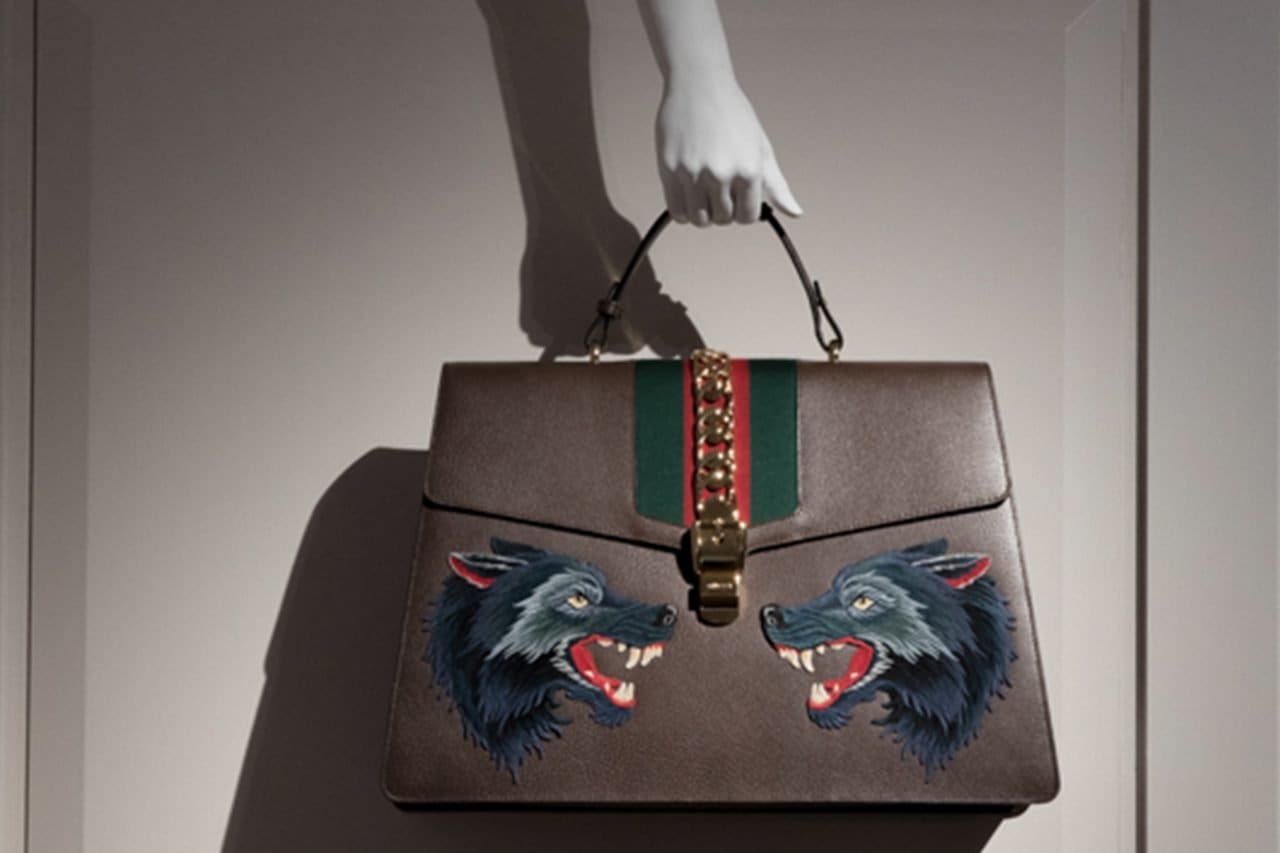 The other exclusive Gucci merchandise available at the store include several one-of-a-kind ready-to-wear creations such as a golden military-style frock coat, complete with frogging, a black and pink short sheepskin coat featuring a green kingsnake on its lining, and a decorative, red peak-lapel garden-print jacket with pink satin trim. There are shoes and bags in unique patterns, prints and colours, such as the Princetown loafer and the Sylvie handbag.