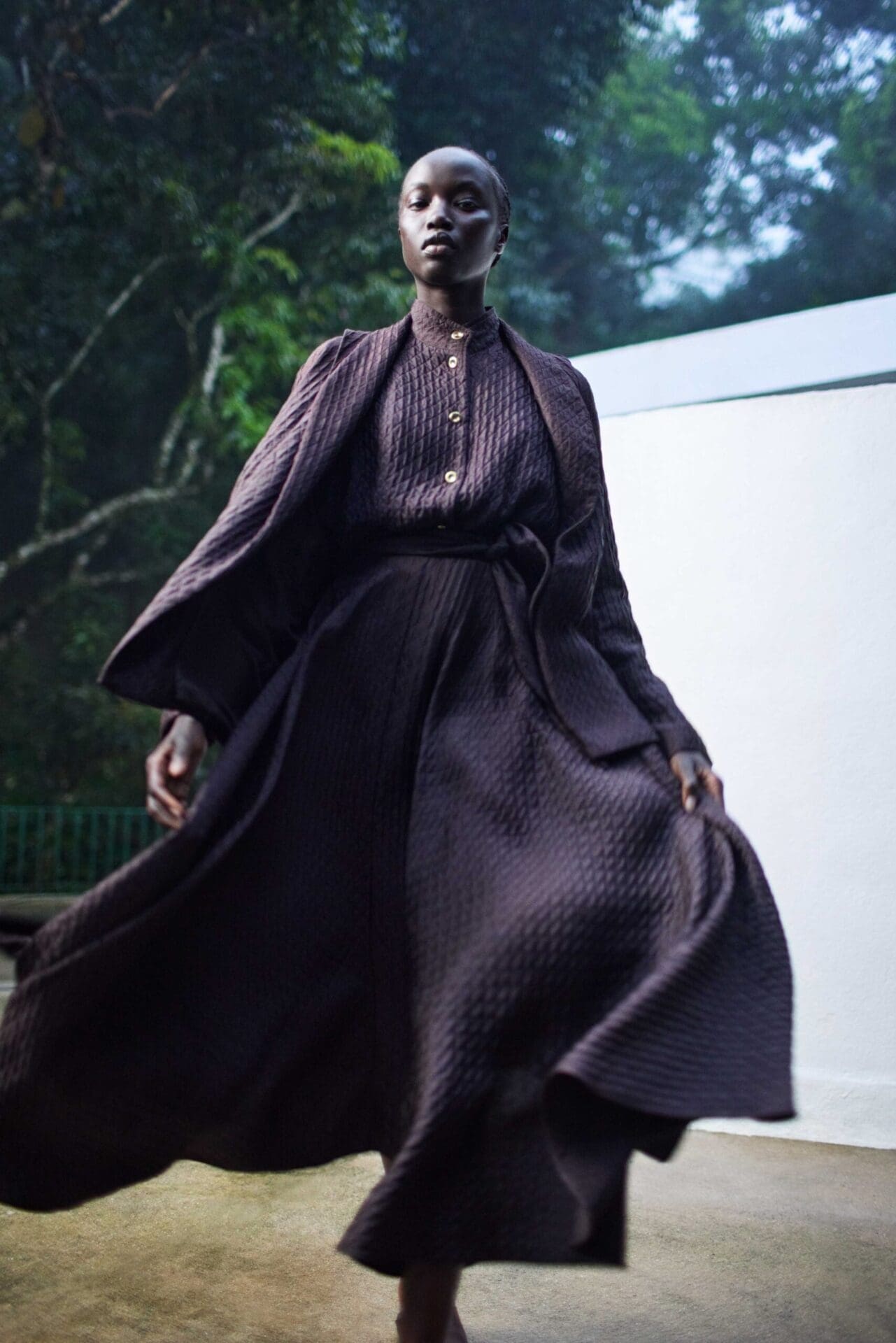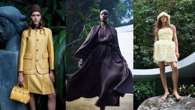 The collection’s rich palette of earthy tones is punctuated with vibrant pops of color, evoking the lively spirit of summer. The visuals, bathed in golden sunlight, are framed by the lush green landscapes of Brazil’s exotic vegetation and the striking modernist design of Casa das Canoas. This celebrated building, designed by Niemeyer, is known for its sweeping curves and organic forms, making it the perfect backdrop for the fluidity and ease of the Loro Piana garments.