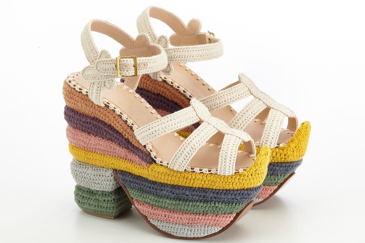 Presented as a limited-edition of 100 pairs, Rainbow Future is a hand-finished platform in veritable wood and crafted in organic crocheted cotton that complies with Global Organic Textile Standard (GOTS). By applying the Layertech technology, the production of its leather lining resulted in no CO2 emission or water consumption. Its glue is water-based, brass is non-galvanized, and its sewing thread is from 100 per cent recycled material. The shoe is then packed in 100 per cent recyclable FSC cardboard shoeboxes and wrapped in 100 per cent biodegradable cotton bags. Each pair of shoes will be accompanied by a limited-edition certificate, describing its history, and its unique characteristics.