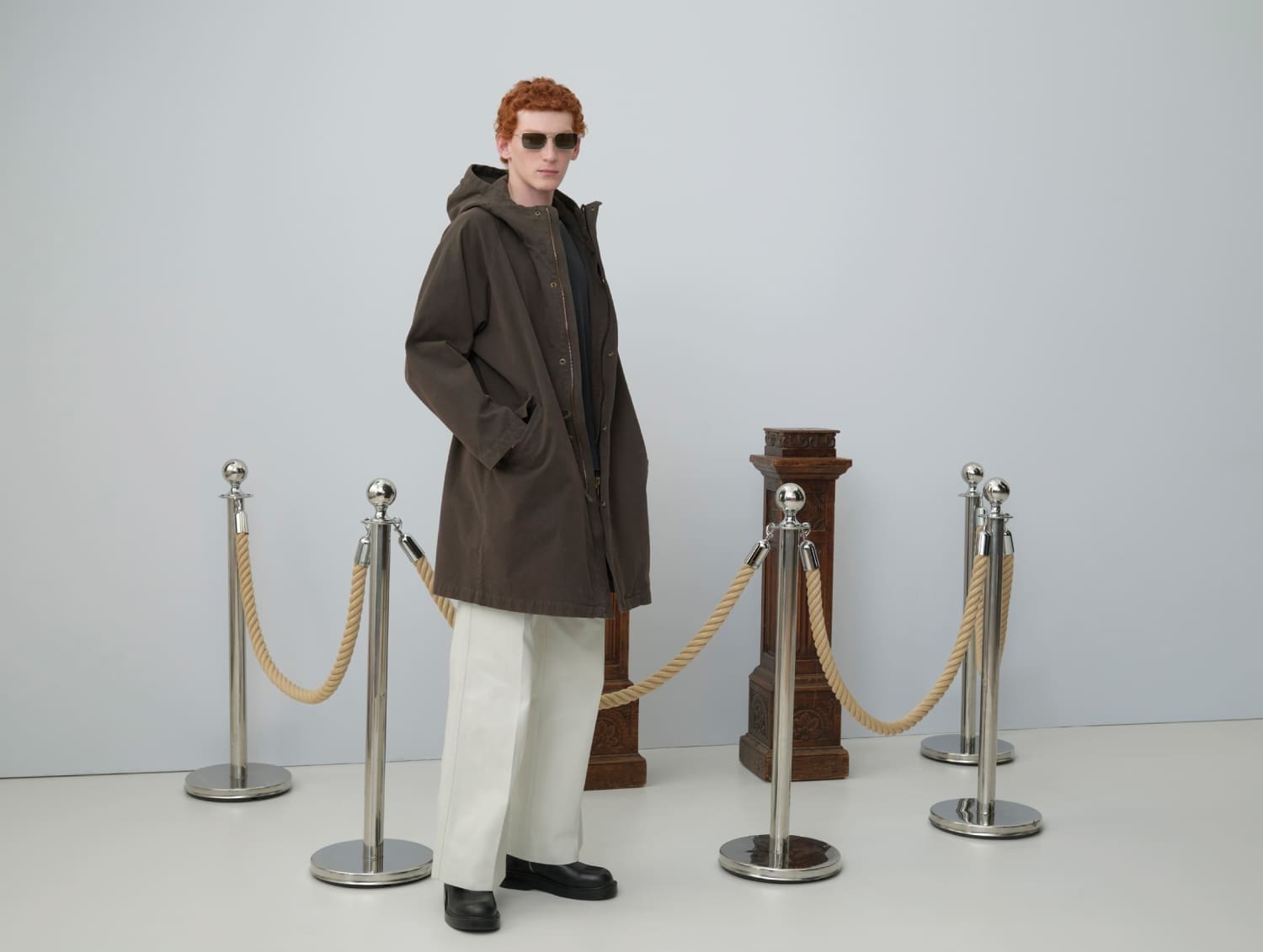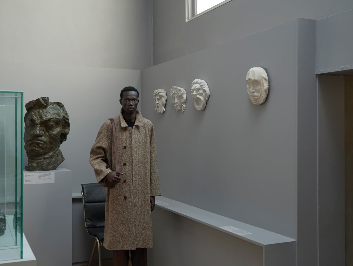 Textures play a starring role this season. Marled cashmere, raw wool, aged leather, raffia, suede, and technical fabrics are brought together in deliberate contrasts, producing garments that engage both sight and touch. This interplay ensures the collection is not only visually compelling but tactilely indulgent.