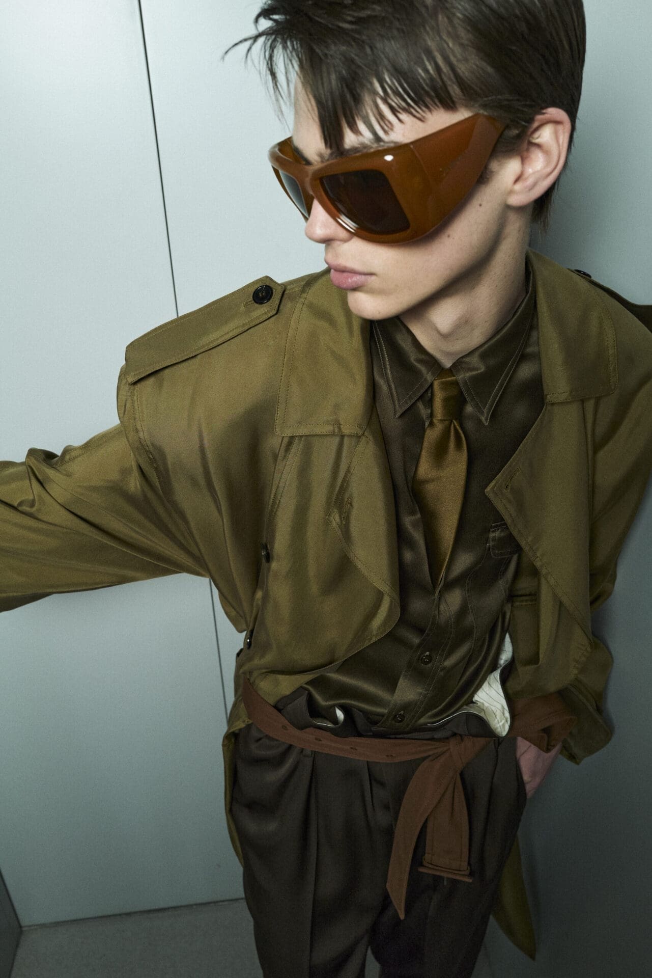 The show paid tribute to a lost generation—Stanton, Angus, Ellis—whose work gave voice and visibility to queer expression at its most vulnerable and powerful. Echoes of Yves Saint Laurent’s own creative exile in 1974 lent the collection a poignant undercurrent. But this was not a homage; it was continuity. Vaccarello reframed sensuality through silhouettes that floated instead of clung—cinched waists, extended shoulders, and whisper-light fabrics in hushed hues of pale ochre, dry moss, and salt. Shorts, reminiscent of a young Yves, appeared not as references but as quiet recurrences—intentional and inevitable.