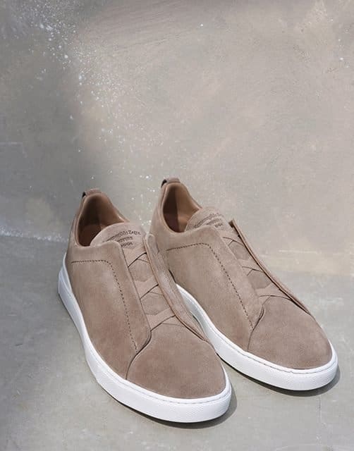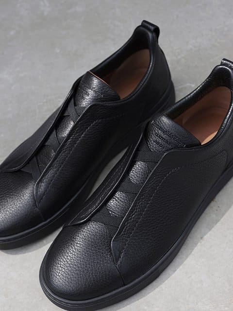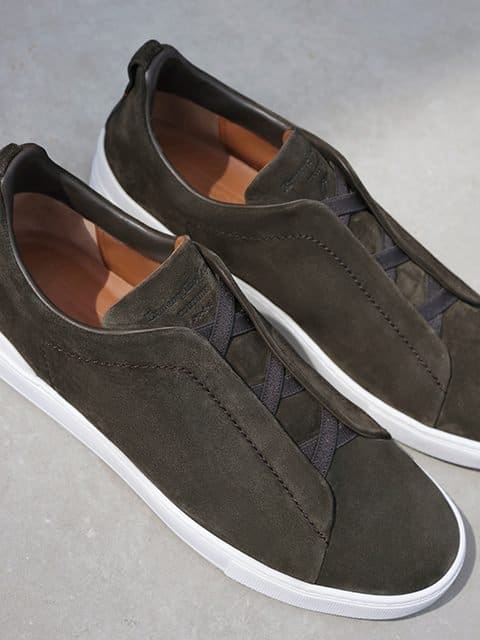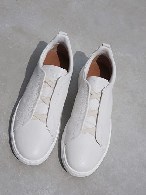 The enduring triple crossed elastic not only means the sneakers slip on and off easily but also speak to Zegna’s heritage, recalling the three hand-stitches on a suit lapel.