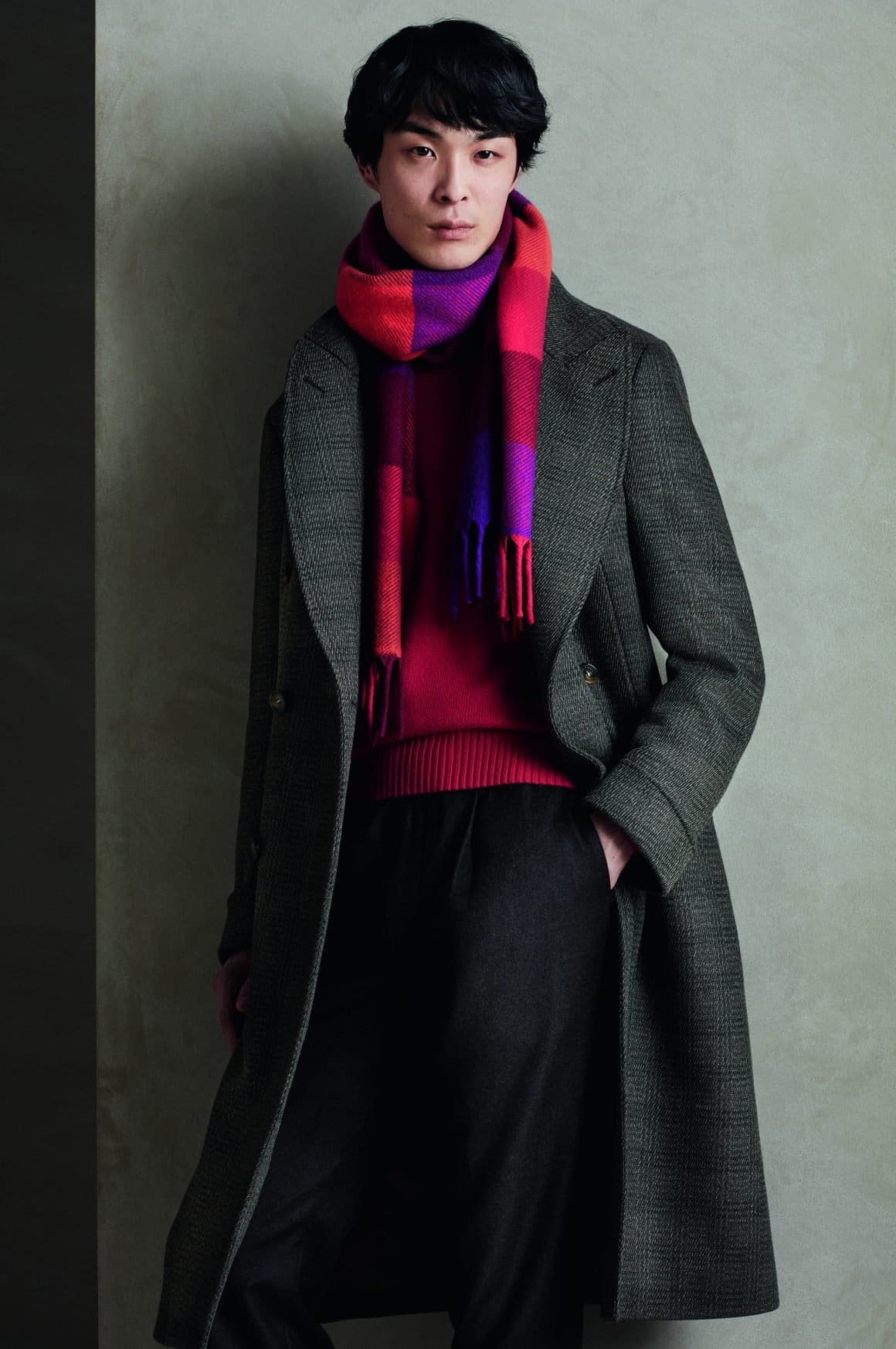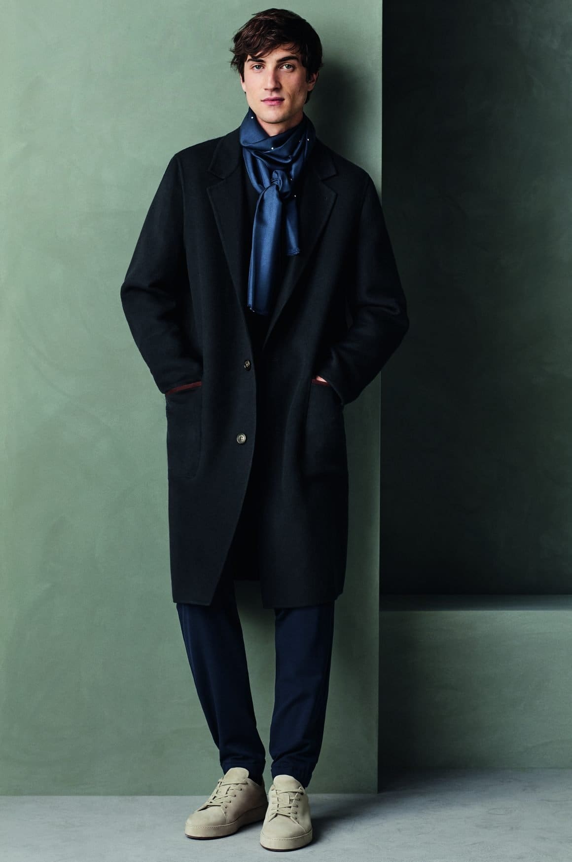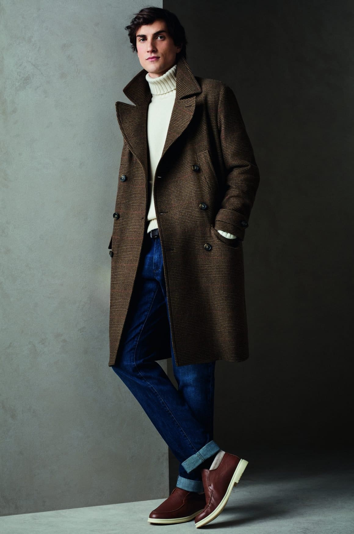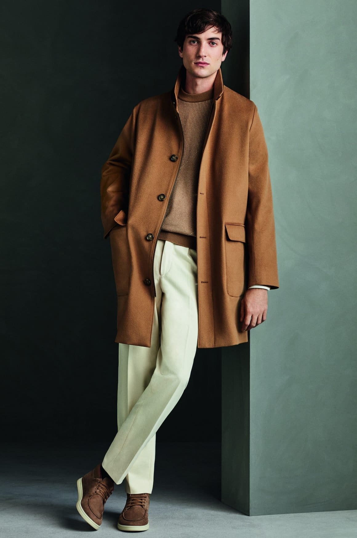 Innovation and tradition are combined with the use of iconic materials including cashmere double, melton cashmere and Baby Cashmere double, and technologies such as Rain System® treatment, applied to a men’s coat in Winter Lightest cashmere double. A blending that gives life to creations unique in their simplicity, synonymous of elegance and refinement. Coats that are soft to the touch, long beyond the knee, to be worn with loose or tight-fitting trousers, which become the expression of a natural style capable of combining urban shades with the charm of elegant and relaxed shapes.
