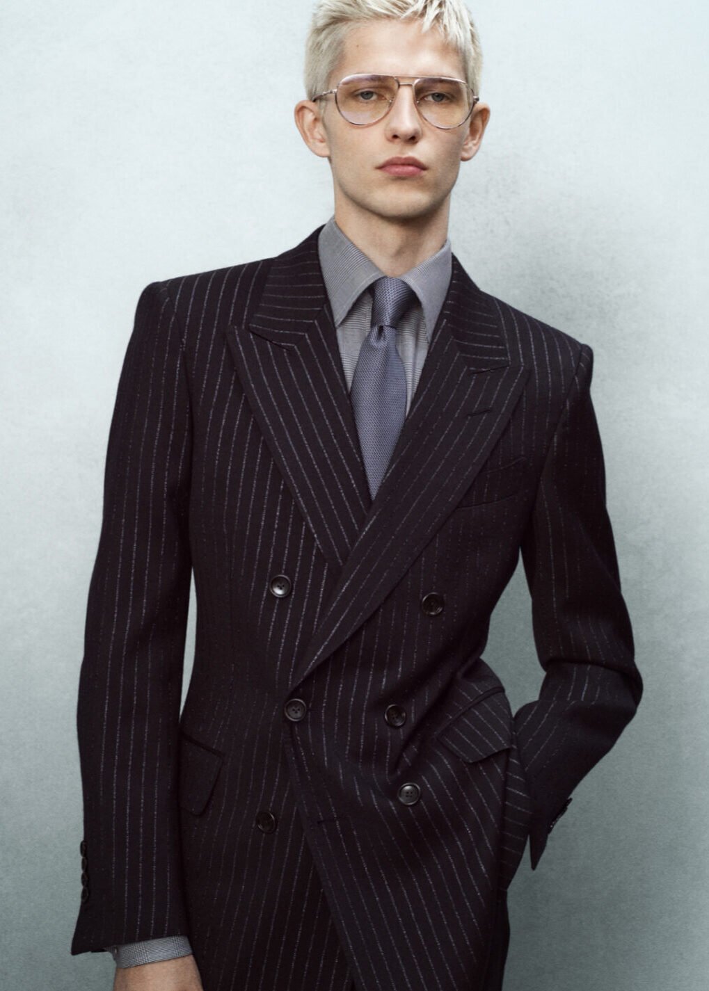 Tailoring remains the foundation. Double-breasted suits with elongated jackets and stovepipe trousers create a lean, assertive silhouette. Car coats cut to the knee, suede jackets, and denim layering pieces expand the outerwear story, offering versatility for both formal and relaxed settings. Each piece is designed with an awareness of proportion, ensuring a modern fit that complements the wearer’s frame.