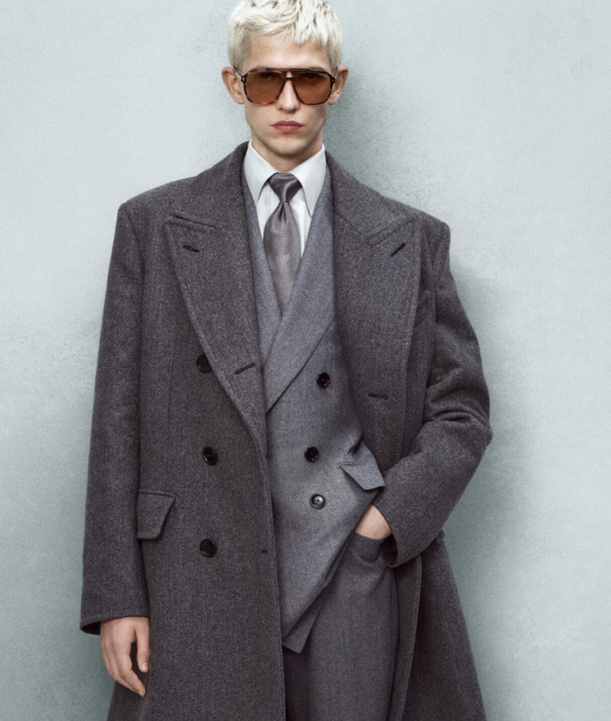 Tailoring remains the foundation. Double-breasted suits with elongated jackets and stovepipe trousers create a lean, assertive silhouette. Car coats cut to the knee, suede jackets, and denim layering pieces expand the outerwear story, offering versatility for both formal and relaxed settings. Each piece is designed with an awareness of proportion, ensuring a modern fit that complements the wearer’s frame.