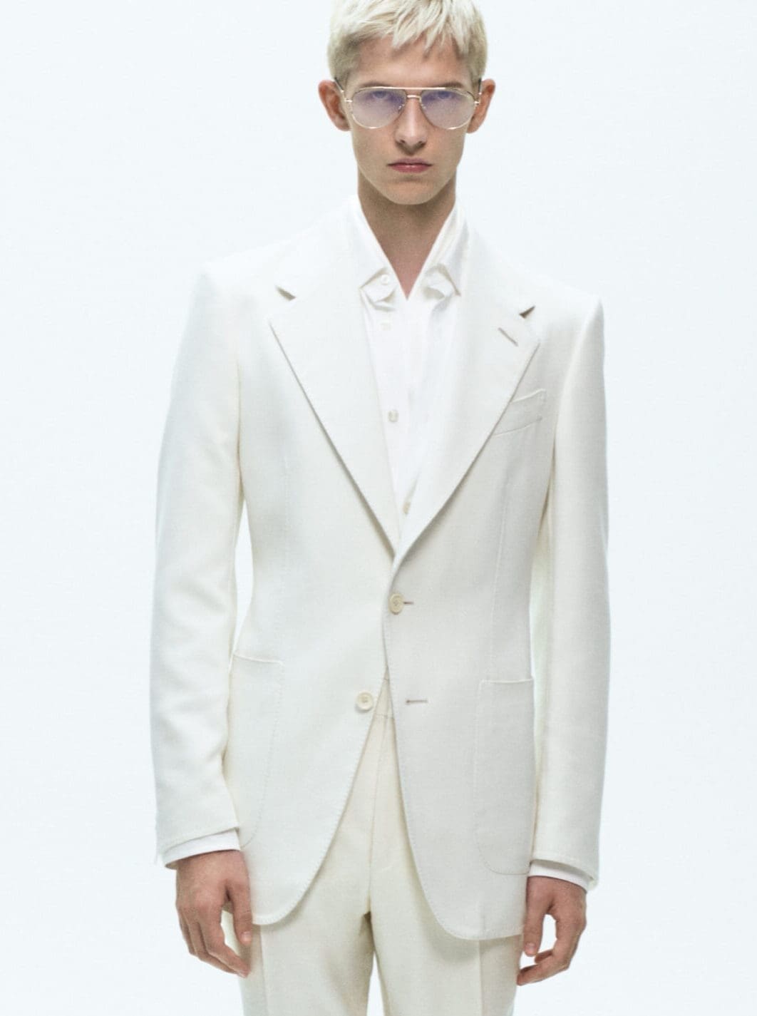 Evenings take on a distinct formality, with black tuxedos cut close to the body, crisp white suits for bold statements, and microdot patterned tailoring that adds subtle visual intrigue. Each is designed for moments when precision matters—whether for a black-tie event or a private dinner in the city.