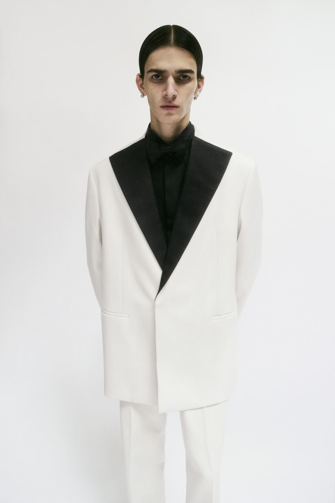 The collection’s tailoring is impeccable. A white suit features a boxy, nonchalant jacket with pitch-black lapels paired with lean, sharp trousers. For a bolder statement, a full shiny brown leather outfit—including a shirt, trousers, and tie—demands attention.