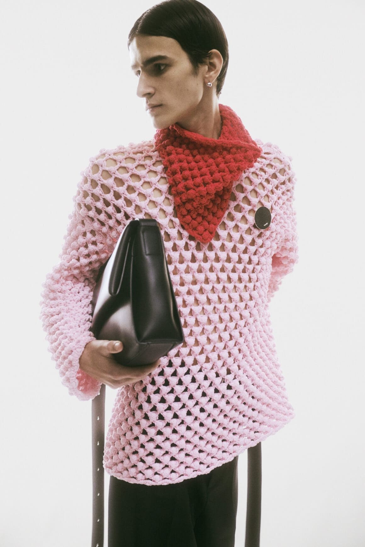 A pale pink pullover, fully knit with hand-made popcorn knots, challenges gender norms, while a dense viscose t-shirt, entirely covered with round beads, epitomizes avant-garde craftsmanship.