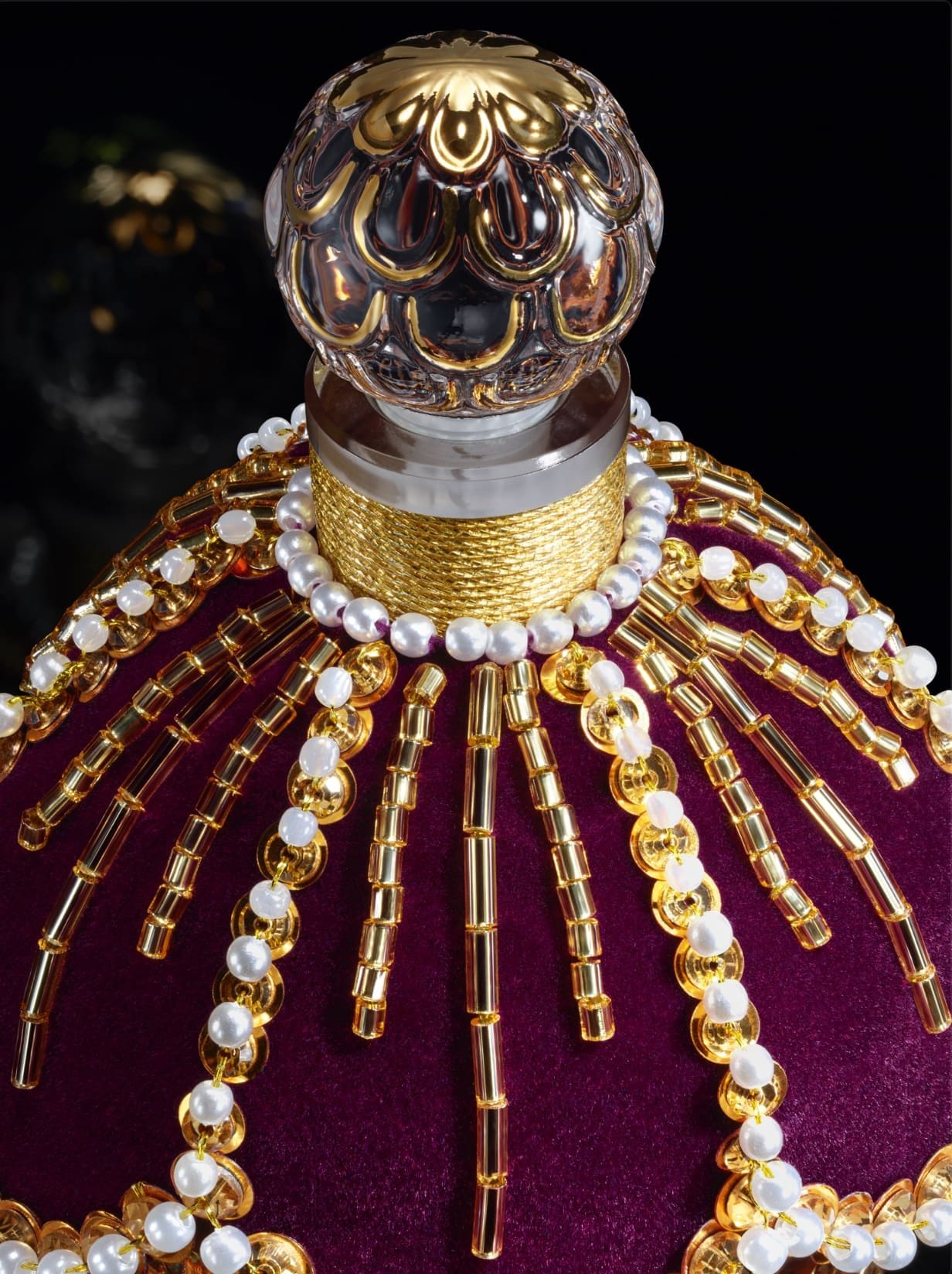 Housed in the legendary Bee Bottle, reimagined with sumptuous purple velvet and pearl adornments, L’Heure Dorée captures the essence of the festival. Every design element speaks to the profound traditions and architectural marvels of the Arab world, where gilded sequins shimmer like celestial mosaics, and smooth pearls recall the domes of majestic palaces. This tribute extends beyond aesthetics; it embodies a deeper resonance—an olfactory and visual testament to the passage of time, the grandeur of culture, and the beauty of tradition.