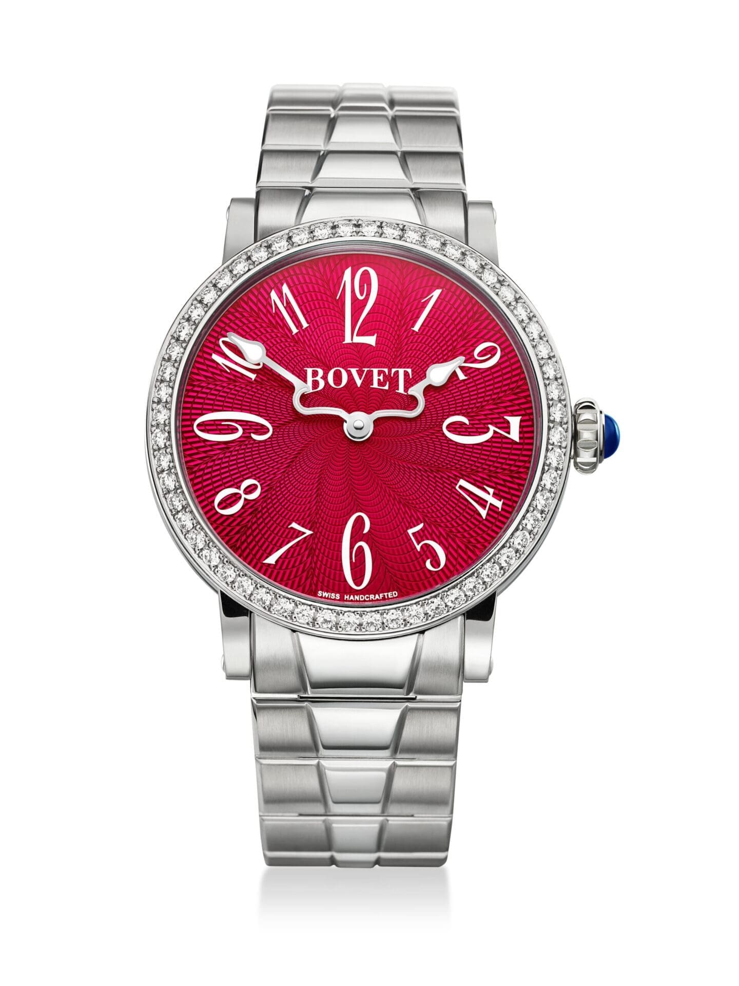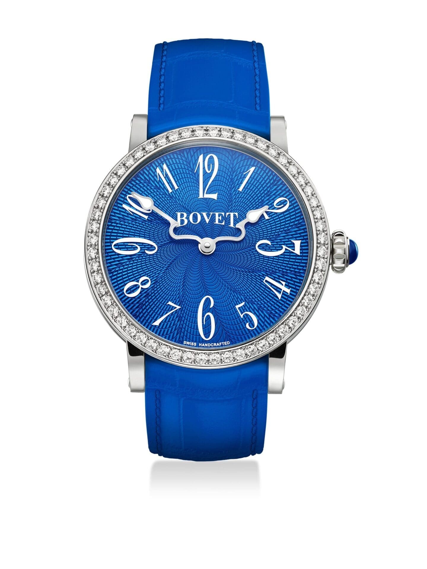 For those drawn to poetic touches, the BOVET Récital 12 36mm stands out as a radiant companion. Its case glitters with 56 brilliant-cut diamonds, framing dials available in raspberry, turquoise guilloché, or mother-of-pearl. Once each hour, the hands meet to form a heart — a quiet moment of intimacy that turns timekeeping into an art form.