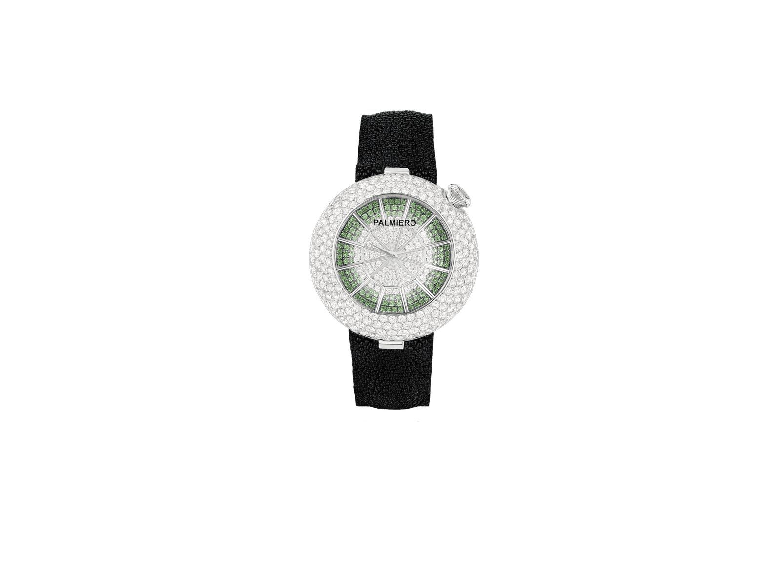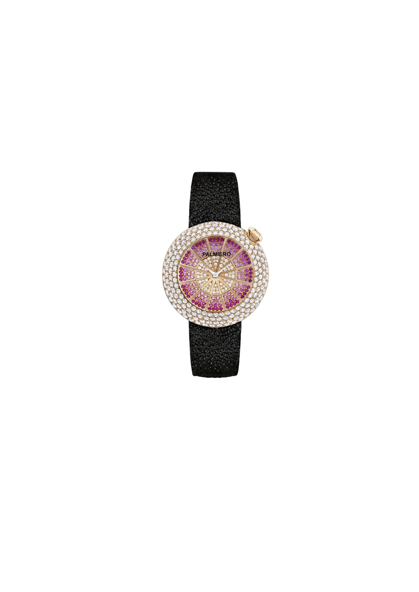 Bolder in spirit is Palmiero’s Alter, a limited-edition design that embodies transformation. Patented pyramidal facets rotate to reveal three distinct dials: one of rich colour, one fully set with diamonds, and one in numbered gold-diamond. Adorned with white diamonds, pink sapphires, or green diamonds, and available in rose or white gold, this watch is as much a jewel as it is a timepiece — a statement that pairs beautifully with both celebratory and everyday abayas.