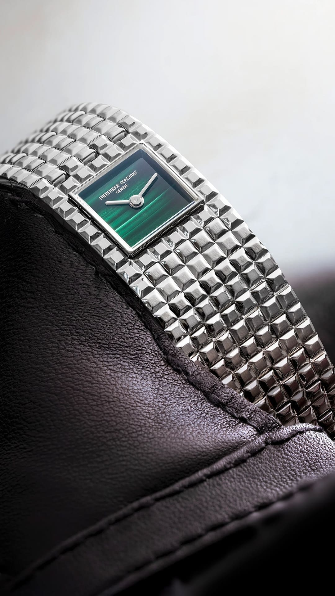 Revisiting the elegance of the cuff, Frédérique Constant’s Classic Manchette introduces a touch of refined femininity. Its elongated rectangular case, paired with a deep green malachite dial, embodies quiet sophistication. The design recalls vintage glamour while maintaining a minimalism that resonates with the abaya’s enduring simplicity.