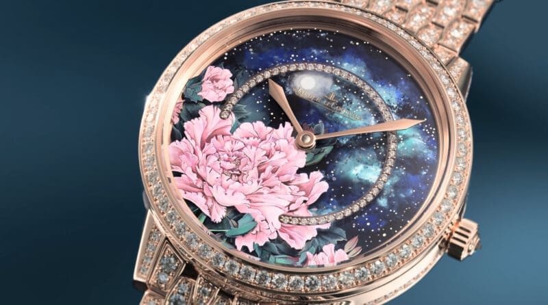This year’s update is presented in two pink gold (18k) variations: one adorned with blue peonies and the other with pink. Both versions feature three intricately layered discs. The top layer, crafted from transparent sapphire, serves as the artist’s canvas, where nine lacquer shades bring pink peonies to life, and twelve shades illuminate the blue. Every stroke is painted by hand, requiring up to 110 hours of precise, uninterrupted artistry. Painted on both sides of the dial, the blooms create depth, dimension, and photo-realistic delicacy.