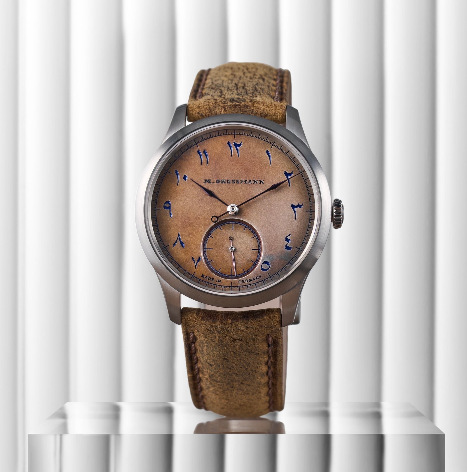 On the dial, the desert narrative reveals itself in texture and tonality. Using a historic 19th-century technique, artisans at the Glashütte manufactory silver-plate the surface by hand, rubbing a specialised silver paste until a velvety grain appears. This silver-brown patina evokes shifting dunes under the desert sun, while the dial’s vintage character is deepened by brown-violet lacquering on the Arabic-Hindi numerals, minute scale, and heritage M. Grossmann signature. Every stroke, every shade, is deliberate — a quiet homage to a region where tradition and modernity coexist in effortless harmony.