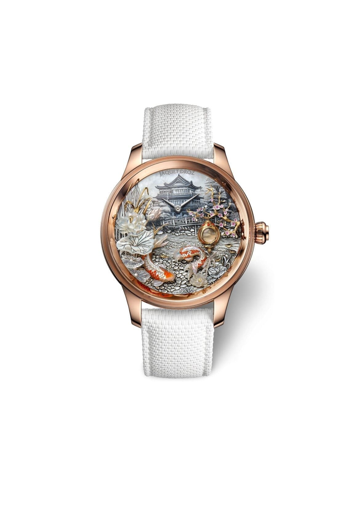 The majority of the appliques are carved from mother-of-pearl, with select details—such as the cherry tree branches and lantern frame—executed in yellow gold. At the centre of the dial sits a mother-of-pearl cabochon that reflects the river and its carp with uncanny realism, faithfully reproducing imagery even on its subtly curved surface.