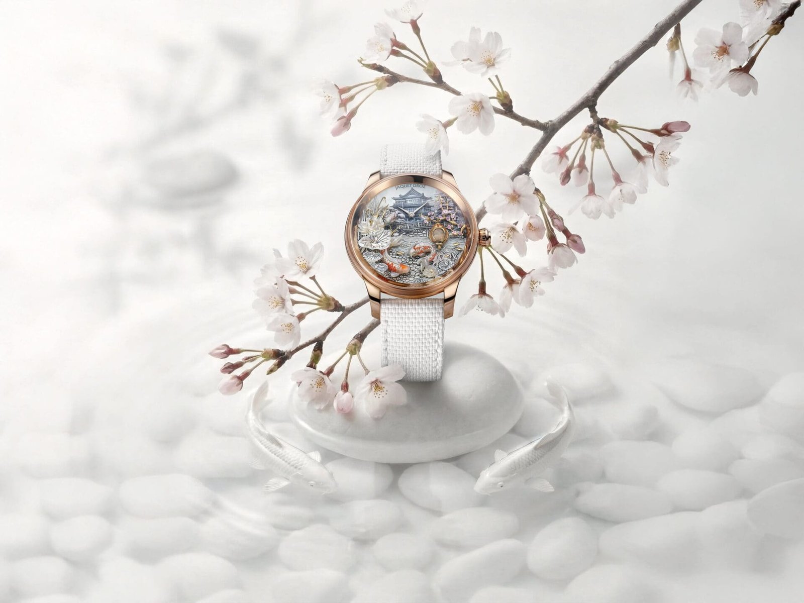 The majority of the appliques are carved from mother-of-pearl, with select details—such as the cherry tree branches and lantern frame—executed in yellow gold. At the centre of the dial sits a mother-of-pearl cabochon that reflects the river and its carp with uncanny realism, faithfully reproducing imagery even on its subtly curved surface.