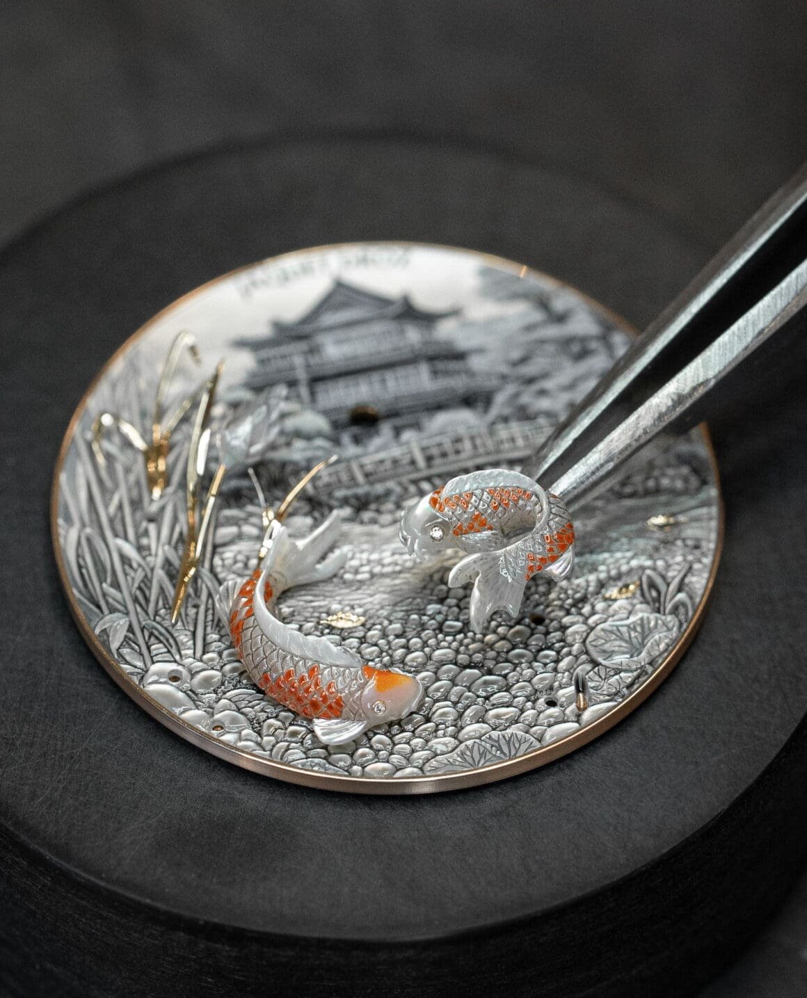 Additional layers of detail enhance the sense of perspective. The hour and minute hands glide beneath the decorative elements, positioned with microscopic accuracy. The koi carp appear to swim below the water lilies, their presence punctuated by 0.5 mm diamonds set into their eyes, catching the light at the surface.