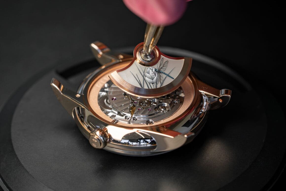 Jaquet Droz has revealed a unique creation that stands as a milestone in artistic watchmaking: the Petite Heure Minute Red Gold – Japanese Garden. Developed in close collaboration with a collector, the piece showcases the manufacture’s mastery of métiers d’art through an entirely hand-crafted mother-of-pearl dial composed of 25 individual appliques.