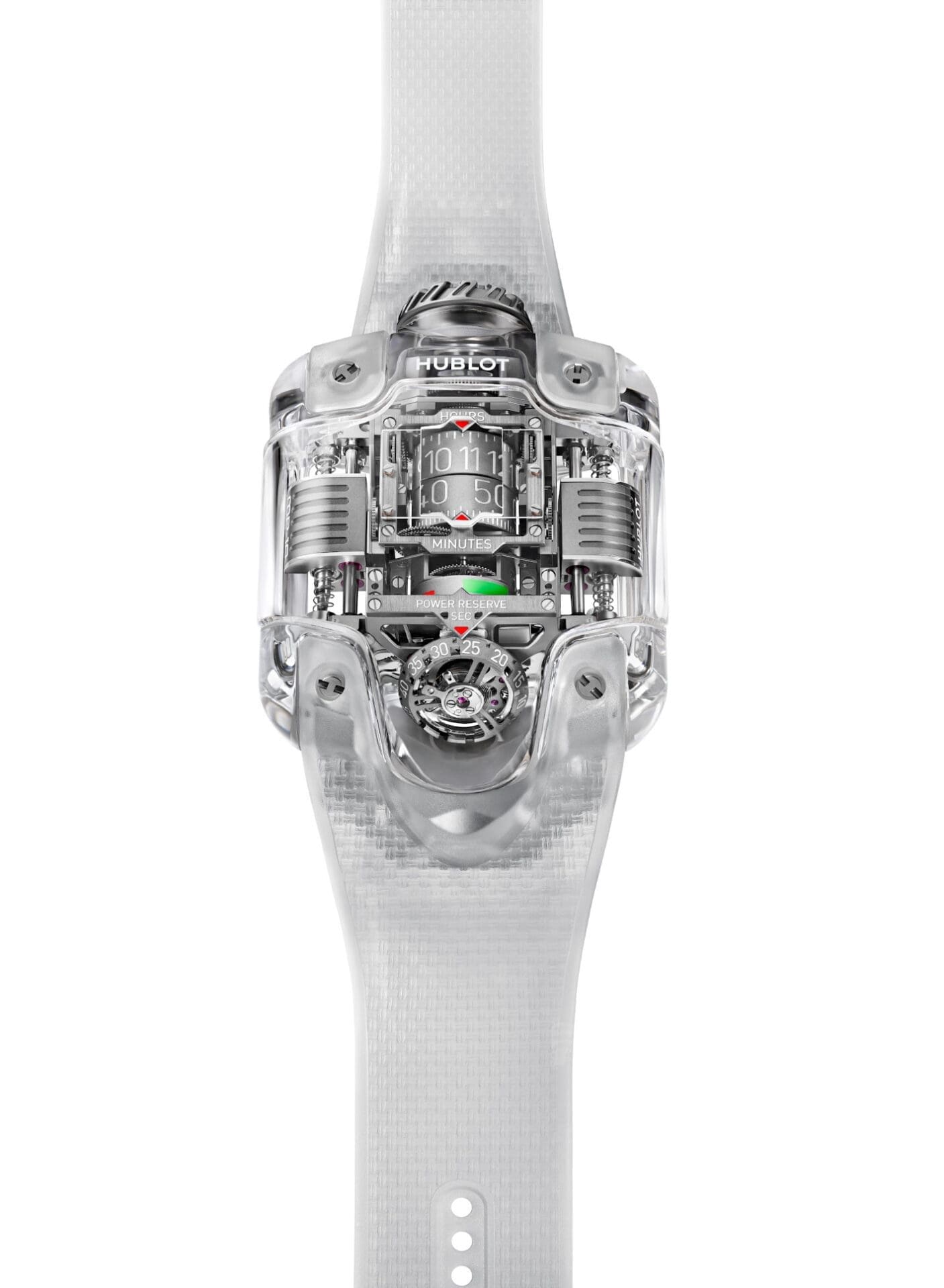 And then, the counterpoint: the MP-10 Sapphire, limited to 30 pieces, is as radical as it is ethereal. Clad entirely in polished translucent sapphire and resting on a matching rubber strap, this iteration reveals everything. Light floods the movement, transforming it into a kinetic sculpture—one whose mechanical anatomy is proudly on display. The grey satin-finished bridges and suspended tourbillon take on a sculptural dimension, enhanced by the absence of color and the fluidity of its surfaces. The hours, minutes, seconds, and power reserve are each given their own dance—subtle, almost imperceptible motions that replace the need for hands with a linear rhythm.