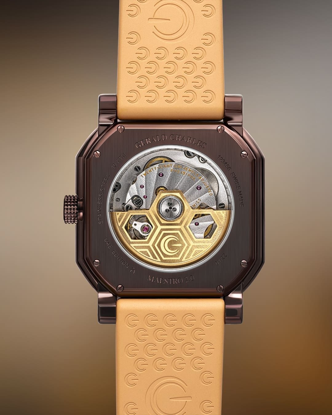 Encasing this natural canvas is the iconic Maestro case, debuting for the first time with a Colormix finish. The metallic bronze-brown hue, created through a proprietary blend of treatments, echoes the warmth of the stone while offering enhanced durability and scratch resistance. Paired with a sand-toned vulcanised rubber strap, the watch evokes the golden landscapes of the UAE, creating a seamless narrative between case, dial, and strap.
