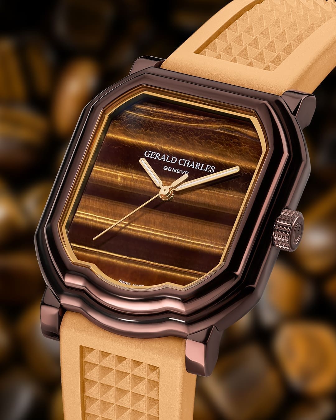 At its heart lies a dial fashioned from Tiger’s Eye, a fibrous quartz admired for its golden shimmer and magnetic play of light. Once a material embraced by watchmakers in the 1970s, here it is reimagined with a contemporary sensibility. Each dial is painstakingly cut, finished, and selected, making every piece not only technically challenging but also a work of natural art, alive with depth and texture.
