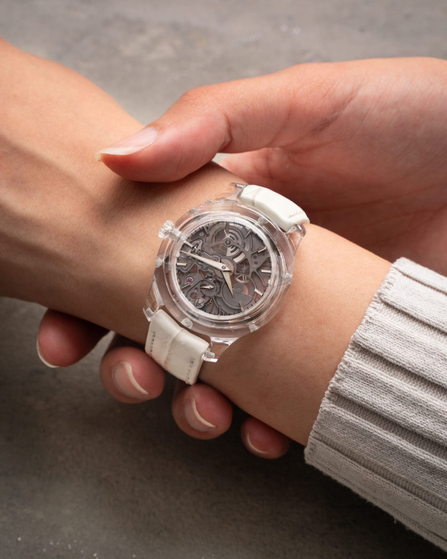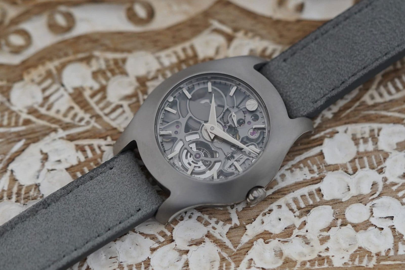 The movement is encased within the 35 mm Wavy case, a signature ArtyA design now presented in a new, refined dimension. Available in either grade 5 titanium or full sapphire crystal, the case offers both resilience and aesthetic harmony. Titanium models showcase a fully sandblasted matte finish with subtle polished contrasts, while the sapphire case reveals a seamless play of light, hand-polished to absolute transparency. Both versions demonstrate ArtyA’s mastery in blending design with durability.
