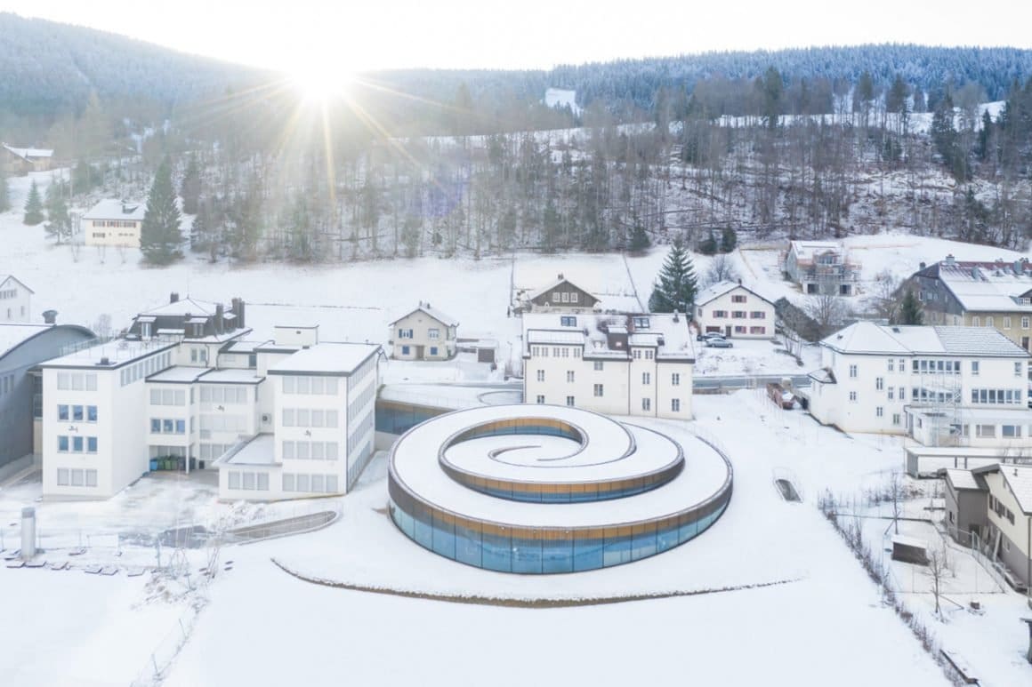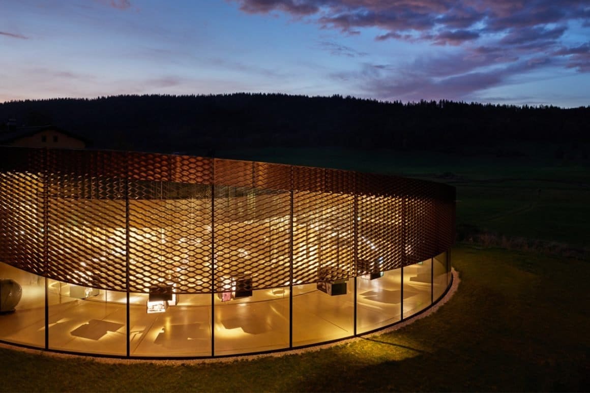 A window on the Vallée de Joux and Audemars Piguet’s craftsmanship – The Musée Atelier’s spiral-shaped pavilion rises on walls of structural curved glass. A feat of engineering and design, it is the first construction of its kind to be built at such altitude. The curved glazing entirely supports the steel roof, while a brass mesh runs along the external surface to regulate light and temperature. The green roof further helps regulate temperature, while absorbing water.