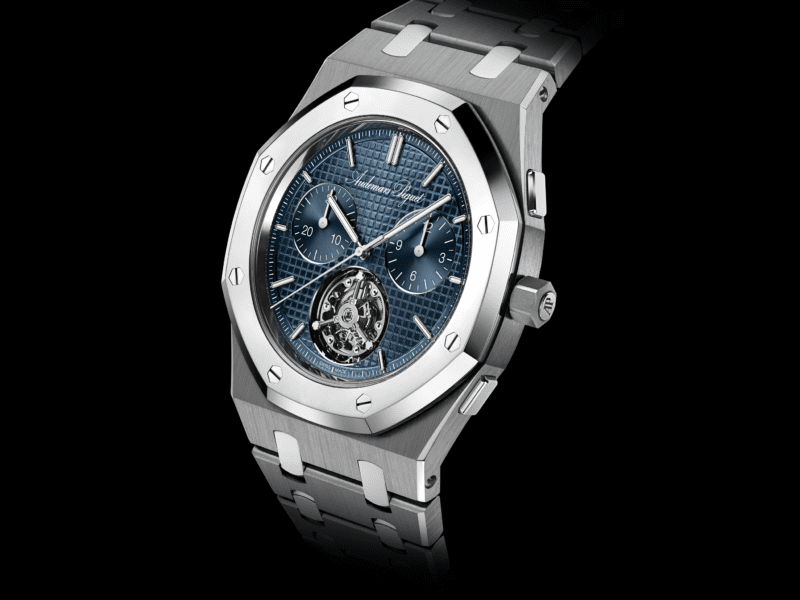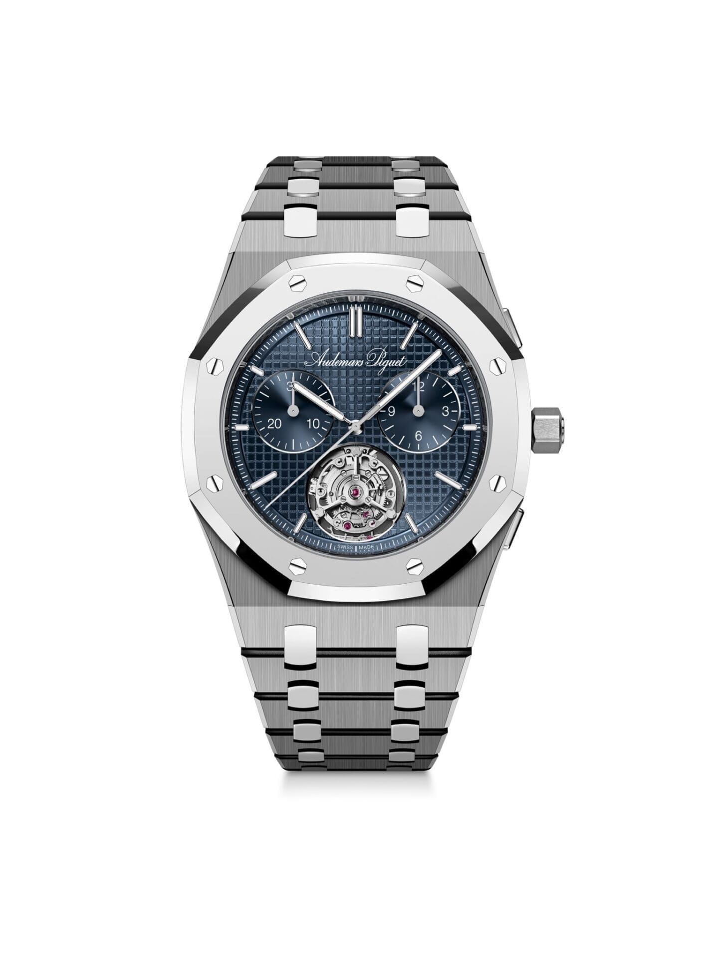 The Royal Oak “Jumbo” has long been an emblem of bold proportions and enduring elegance, designed by Gérald Genta in 1972 and instantly earning its nickname. Now, for the first time in its 50-year history, the “Jumbo” unites a selfwinding chronograph with a flying tourbillon, presenting a dual complication that preserves its iconic 39 mm diameter and 8.1 mm thickness while enhancing the tactile experience of its functions. Every element of the chronograph has been meticulously redesigned to achieve a sensation of effortless use, minimizing resistance while maintaining mechanical complexity. The result is a watch that embodies refined visual simplicity and ergonomic sophistication, seamlessly integrating performance with the aesthetic legacy of the Royal Oak.