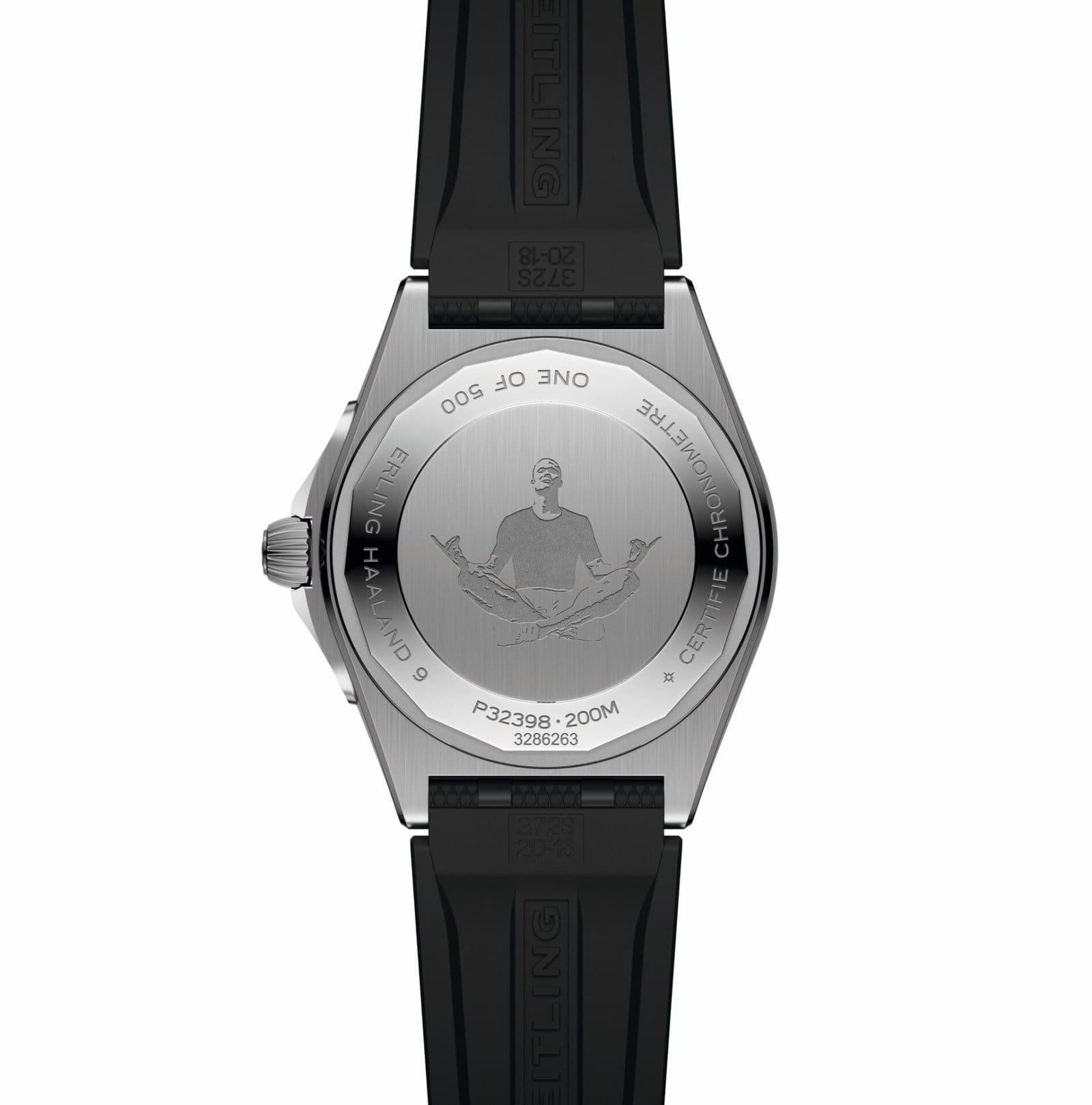 The Chronomat Automatic GMT 40 features a stainless steel case with a platinum bezel, paired with a meteorite dial and Haaland’s initials subtly integrated into the central seconds hand. Red-gold accents and a choice of black rubber or steel rouleaux bracelet make it a striking everyday piece. Meanwhile, the Chronomat B01 42 steps things up with an 18k red-gold case, black subdials, and a sapphire crystal caseback revealing the in-house movement.