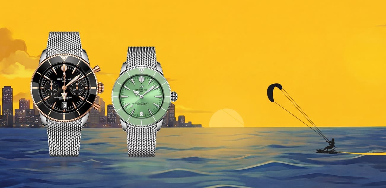 Crossing into the Sea universe, the upgraded Superocean Heritage channels the spirit of the 1957 original. The Superocean Heritage B01 Chronograph 42 and Superocean Heritage Automatic 36 honour the sleek proportions and distinctive spear-and-arrow hands that once redefined dive watch design. Modern enhancements include ceramic-inlay bezels, integrated mesh bracelets and tone-on-tone subdials, ensuring clarity above and below the surface.