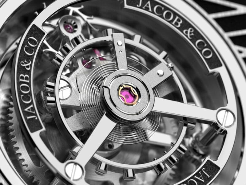 Jacob & Co. references this automotive iconography with remarkable depth. The grille houses a vertically mounted flying tourbillon—an advanced horological complication originally designed for precision in vertically positioned clocks. In the Calandre, the complication not only serves its technical purpose but visually echoes the aerodynamics and performance heritage of Bugatti’s latest hyper sports car, the Bugatti Tourbillon.