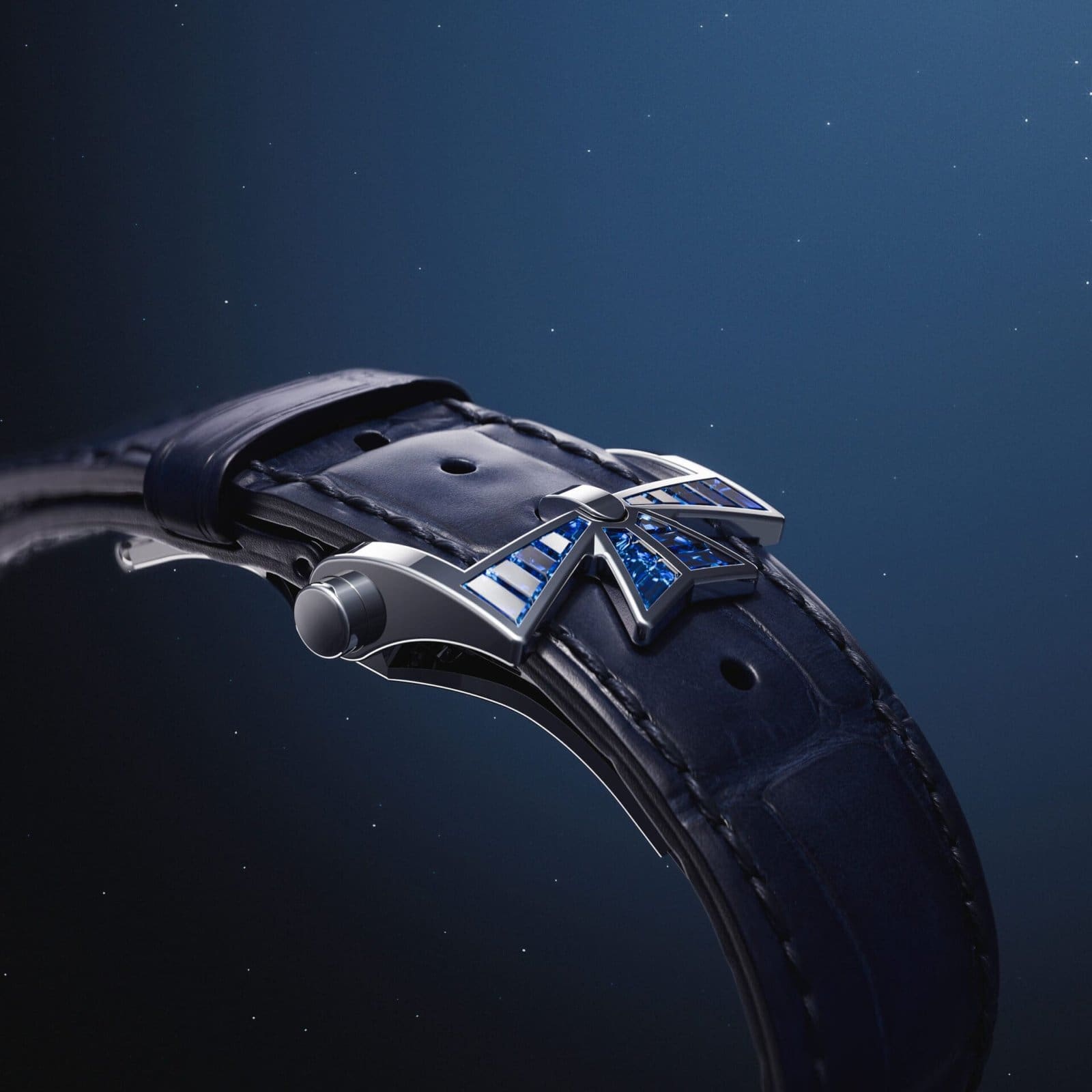 It takes approximately 16 hours to complete the guilloché for a single zodiac sign, followed by a series of eight meticulous steps—from sunburst finishing to tourbillon aperture cutting, color application, and diamond setting. Over 27 hours are devoted solely to setting 96 baguette-cut sapphires that embellish the bezel, lugs, and clasp. The result is a seamless celebration of both technical and artistic mastery.